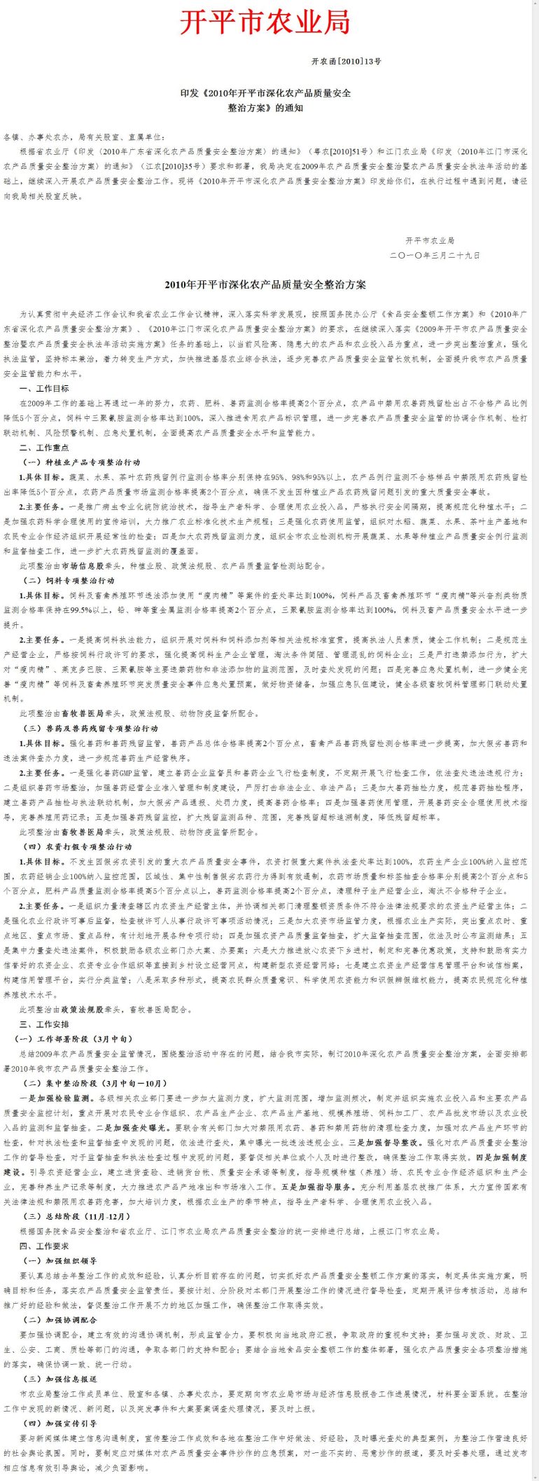 2010年開平市深化農(nóng)產(chǎn)品質(zhì)量安全整治方案