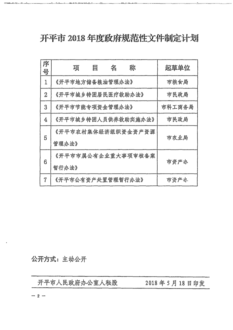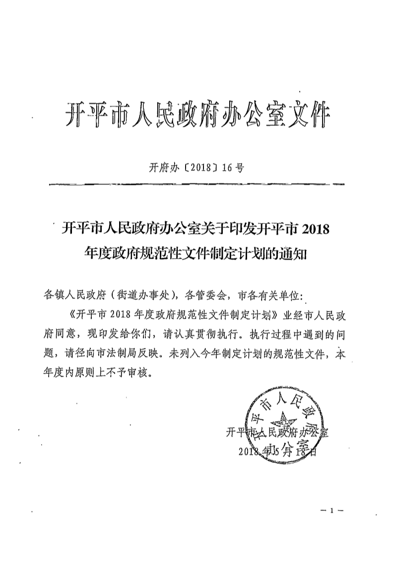 開平市人民政府辦公室關(guān)于印發(fā)開平市2018年度政府規(guī)范性文件制定計(jì)劃的通知