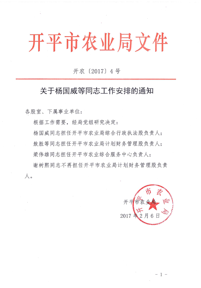 關(guān)于楊國(guó)威等同志工作安排的通知(開農(nóng)【2017】4號(hào))