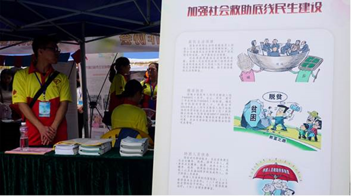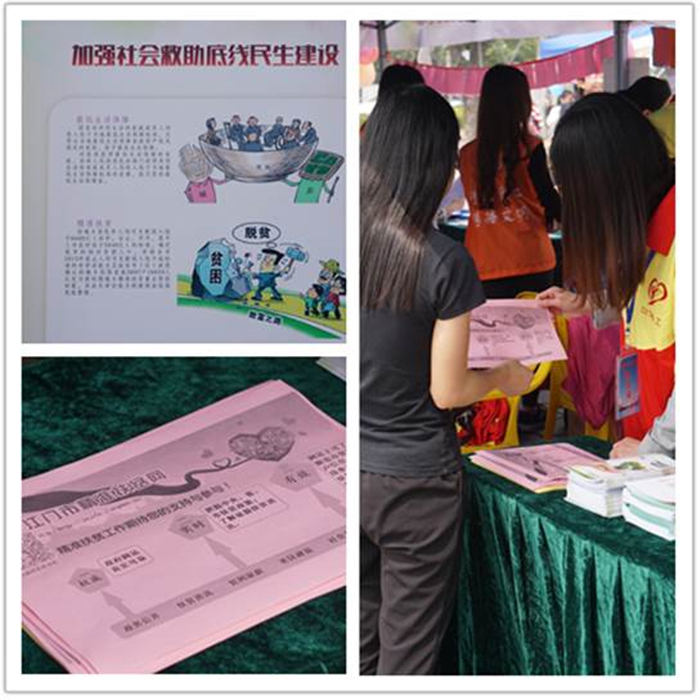 “僑鄉(xiāng)社工宣傳周”活動現(xiàn)場 3月21日江門市扶貧辦與江門市民政部門借助江門市第六屆“僑鄉(xiāng)社工宣傳周”活動場地,向廣大市民宣傳我市城鄉(xiāng)精準(zhǔn)扶貧工作。 活動當(dāng)天,前來江門市工人文化宮參與活動的市民絡(luò)繹不絕。江門市扶貧辦與江門市民政局的同志熱情地向市民群眾宣傳、講解江門市城鄉(xiāng)精準(zhǔn)扶貧工作的相關(guān)政策及2016年度江門市扶貧工作成果,現(xiàn)場派發(fā)了宣傳單。市民紛紛點(diǎn)贊,認(rèn)為江門市出臺的精準(zhǔn)扶貧政策接地氣、解民困,切切實(shí)實(shí)為貧困群體解決生產(chǎn)生活的難題。 自2016年開展城鄉(xiāng)精準(zhǔn)扶貧工作以來,江門市扶貧部門通過各級幫扶單位精準(zhǔn)幫扶,江門市有勞動能力的重點(diǎn)幫扶對象5097戶16659人生產(chǎn)生活條件得到很大改善。其中,重點(diǎn)幫扶對象1429戶實(shí)現(xiàn)了精準(zhǔn)脫貧。 精準(zhǔn)扶貧宣傳攤位 工作人員向市民講解扶貧工作并派發(fā)精準(zhǔn)扶貧宣傳單