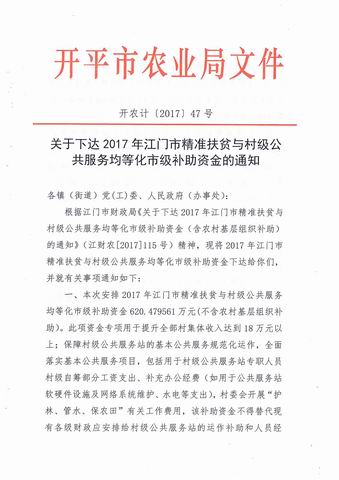 關(guān)于下達(dá)關(guān)于下達(dá)2016年江門市精準(zhǔn)扶貧與村級公共服務(wù)均等化市級補助資金計劃的通知