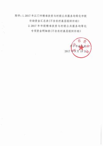 附件1-2 2017年江門市精準(zhǔn)扶貧與村級公共服務(wù)均等化市級補助資金匯總表及明細(xì)表(不含農(nóng)村基層組織補助)_1514612750915.pdf