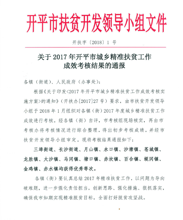 關(guān)于2017年開(kāi)平市城鄉(xiāng)精準(zhǔn)扶貧工作成效考核結(jié)果的通報(bào)