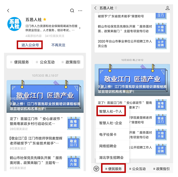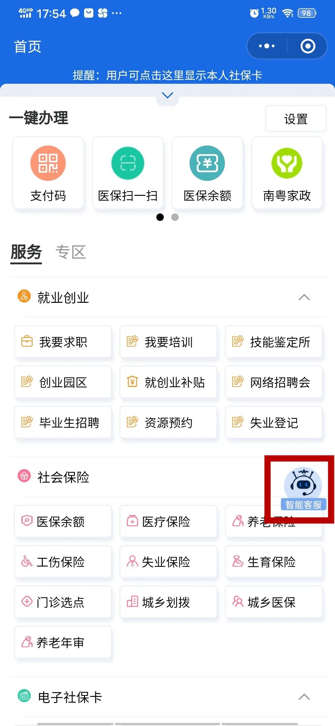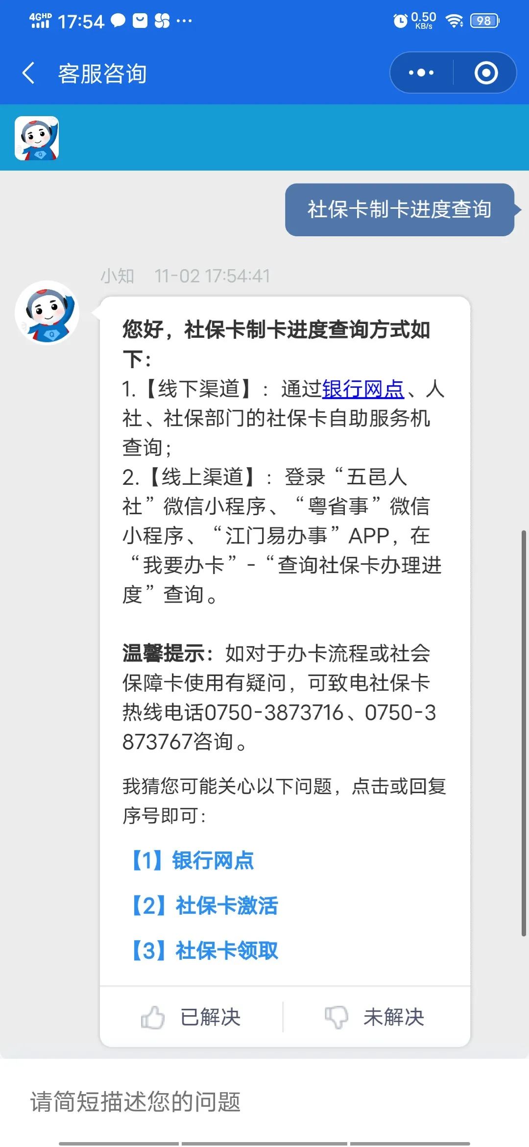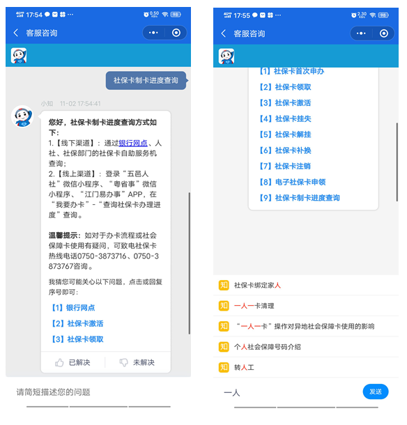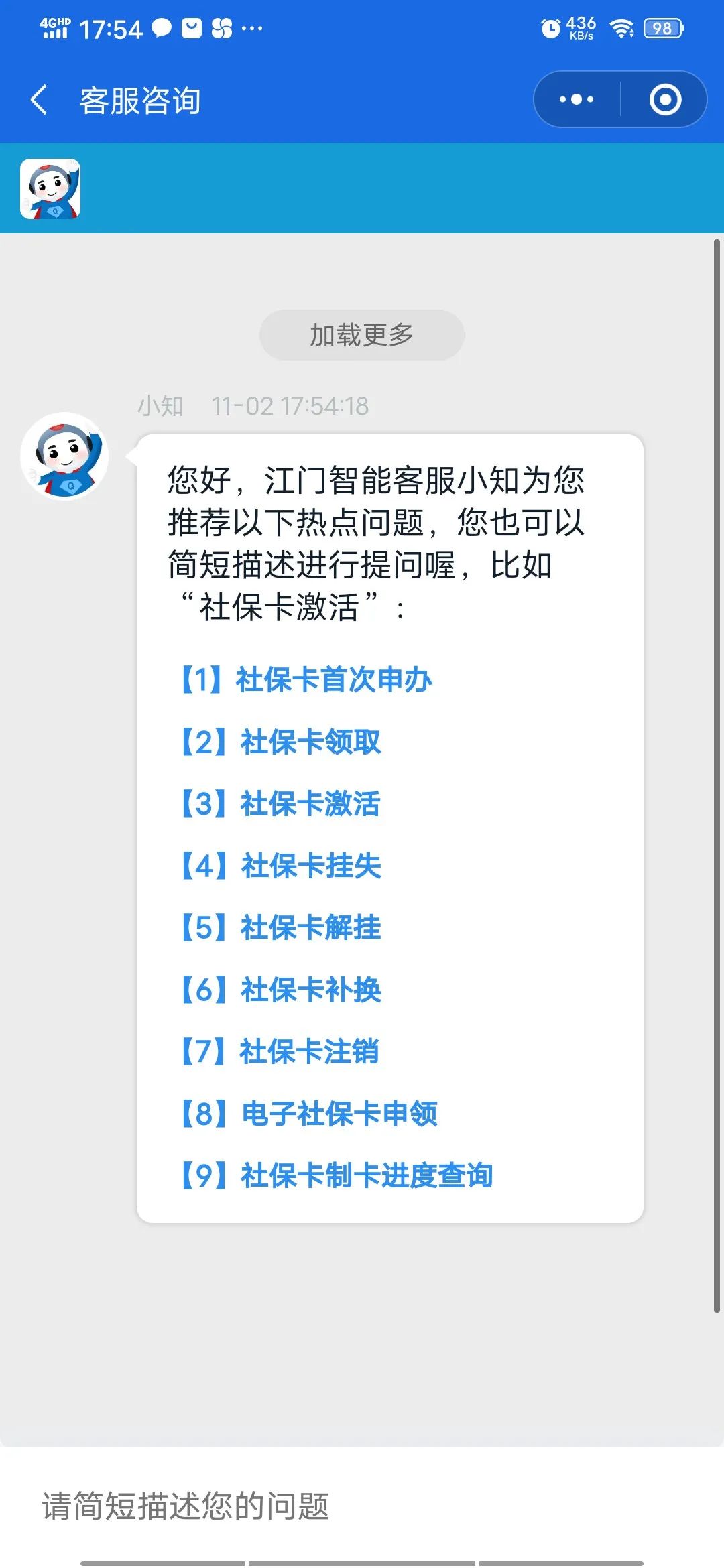 1.進(jìn)入“五邑人社”微信公眾號(hào),在“便民服務(wù)”菜單中選擇“智慧人社-個(gè)人” ,如下圖: 2 . 進(jìn) 入 “五邑人社”小程序,點(diǎn)擊機(jī)器人圖標(biāo),如下圖,即可進(jìn)入智能客服頁(yè)面: 1.藍(lán)色字體為便捷回復(fù)的目錄,點(diǎn)擊后,系統(tǒng)將自動(dòng)發(fā)送對(duì)應(yīng)問(wèn)題的解答內(nèi)容: 2.下面的輸入框可自定義輸入您想咨詢(xún)的問(wèn)題,智能客服可以快速識(shí)別您的問(wèn)題: 3.準(zhǔn)確提供相關(guān)單位地址、業(yè)務(wù)辦理材料: