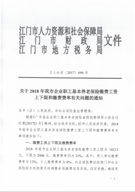 現(xiàn)將江門市人力資源和社會(huì)保障局、江門市財(cái)政局、江門市地方稅務(wù)局《關(guān)于2018年我市企業(yè)職工基本養(yǎng)老保險(xiǎn)繳費(fèi)工資上下限和繳費(fèi)費(fèi)率有關(guān)問題的通知》(江人社發(fā)〔2017〕696號(hào))轉(zhuǎn)發(fā)給你們,請(qǐng)認(rèn)真貫徹執(zhí)行,并做好相關(guān)的宣傳解釋工作。
