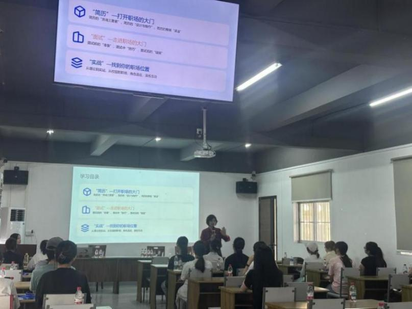 緊接著,活動(dòng)邀請(qǐng)到兩位職業(yè)規(guī)劃領(lǐng)域的導(dǎo)師開展授課。職業(yè)生涯規(guī)劃師、現(xiàn)江門博高咨詢管理有限公司高級(jí)合伙人——陳小玲開展“職場(chǎng)加速器——讓你快速拿到Offer”主題授課,內(nèi)容包含簡歷的設(shè)計(jì)與制作、面試的準(zhǔn)備以及技巧運(yùn)用。廣東冠星新型材料有限公司行政人事部經(jīng)理胡國城則針對(duì)應(yīng)屆畢業(yè)生初進(jìn)職場(chǎng)的求職技巧與職業(yè)規(guī)劃進(jìn)行授課,幫助高校生掌握實(shí)用有效的求職技巧。