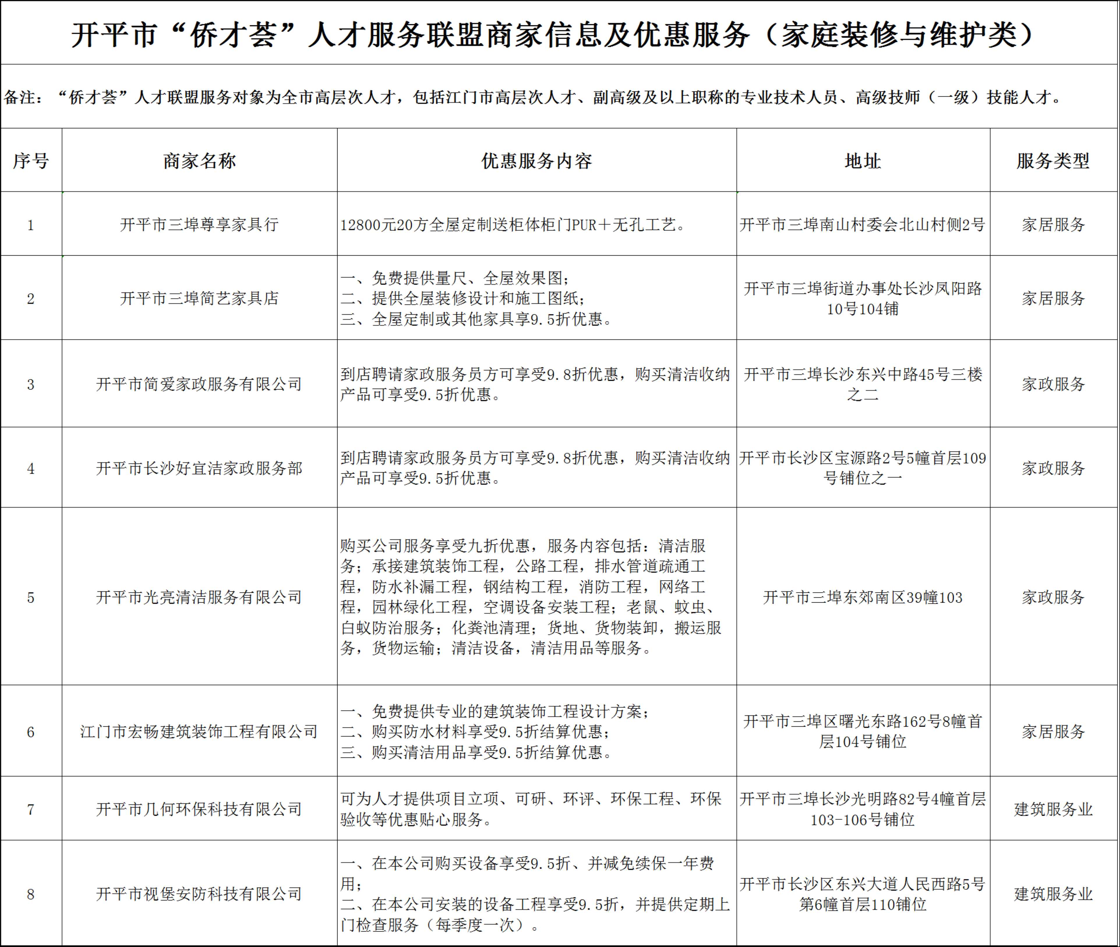 開(kāi)平市“僑才薈”人才服務(wù)聯(lián)盟商家信息及優(yōu)惠服務(wù)(家庭裝修與維護(hù)類)分表.xlsx