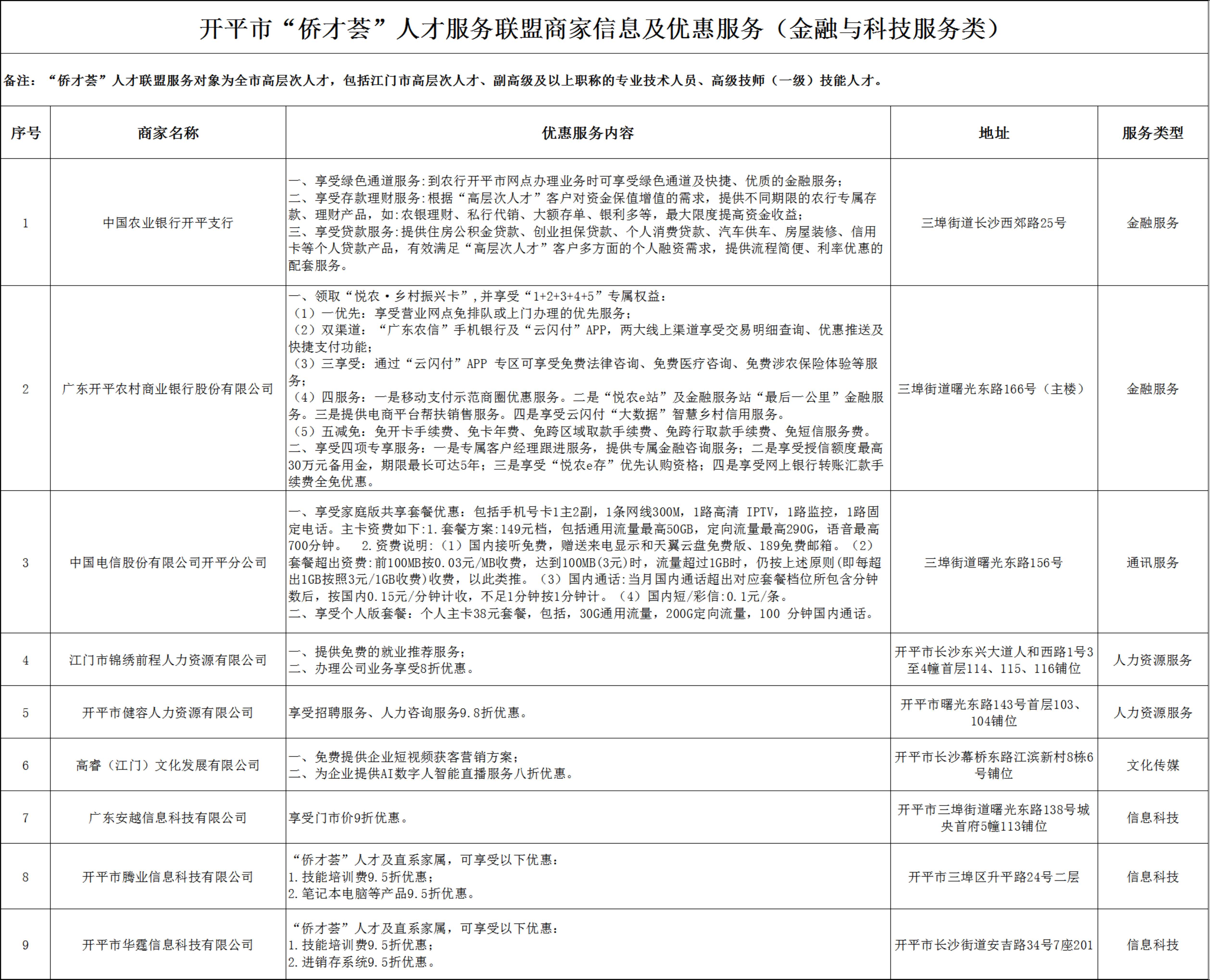 開(kāi)平市“僑才薈”人才服務(wù)聯(lián)盟商家信息及優(yōu)惠服務(wù)(金融與科技服務(wù)類)分表.xlsx