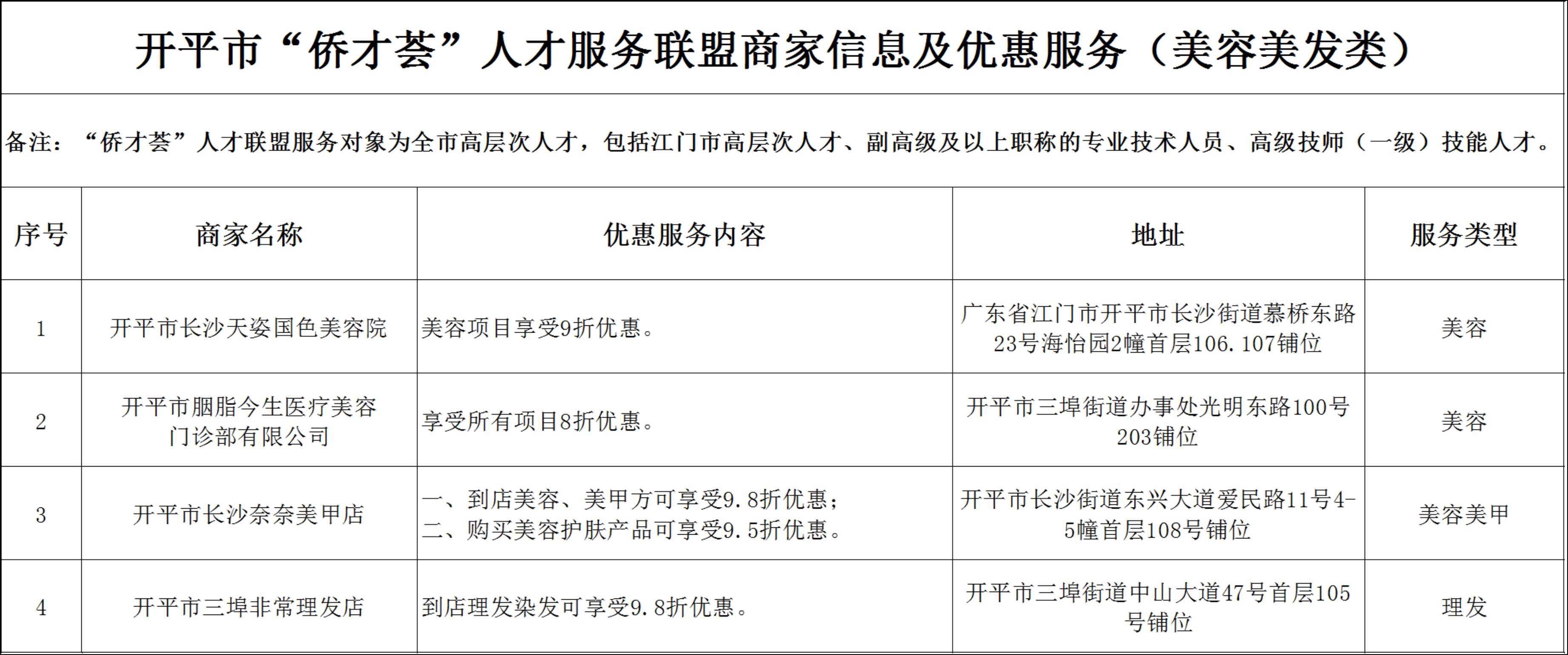 開(kāi)平市“僑才薈”人才服務(wù)聯(lián)盟商家信息及優(yōu)惠服務(wù)(美容美發(fā)類)分表.xlsx