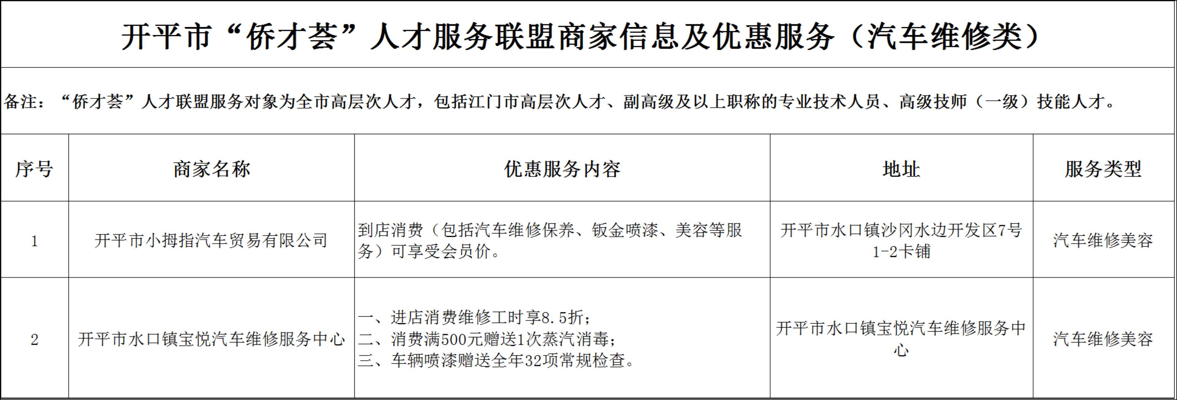 開(kāi)平市“僑才薈”人才服務(wù)聯(lián)盟商家信息及優(yōu)惠服務(wù)(汽車維修類)分表.xlsx