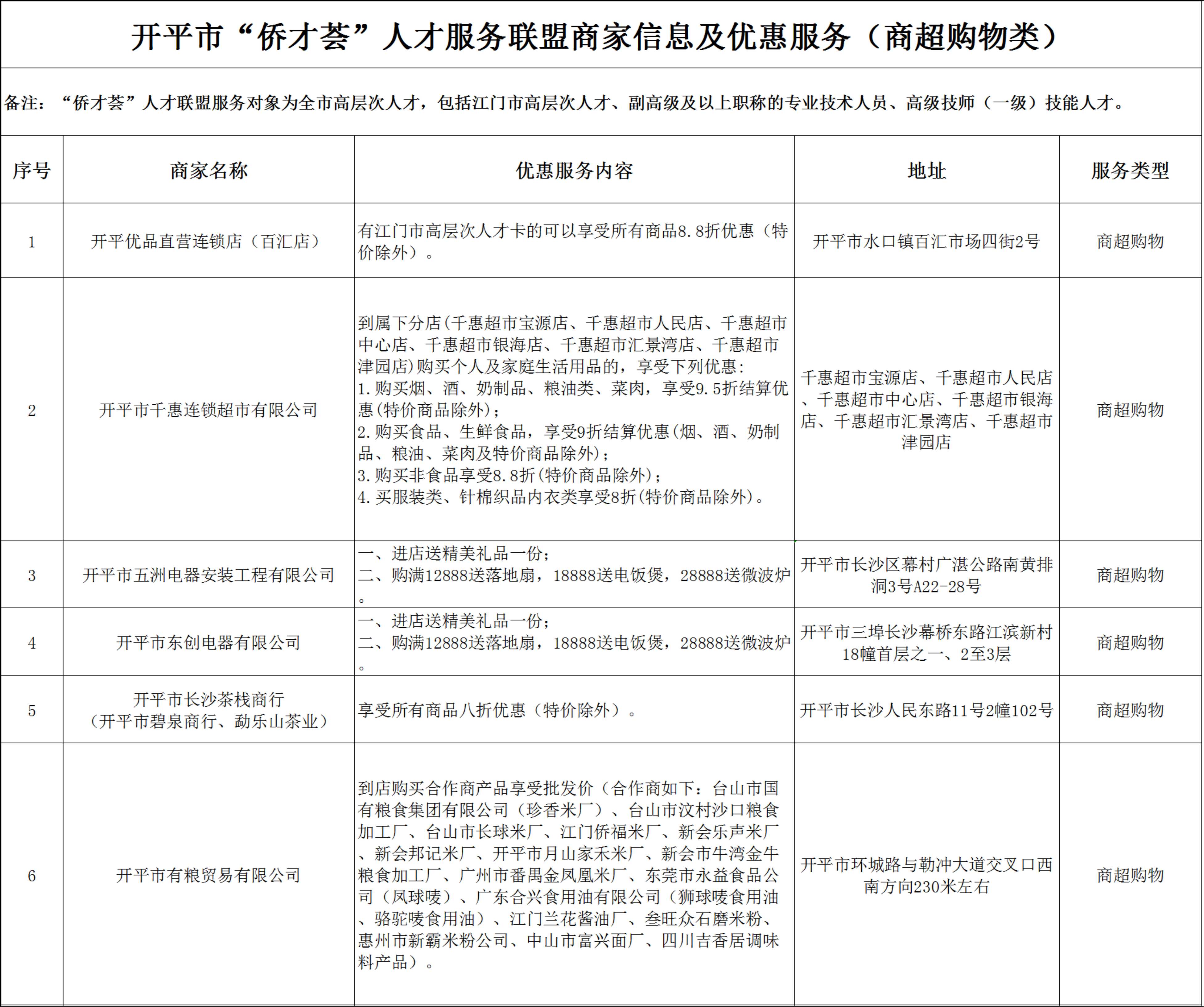 開(kāi)平市“僑才薈”人才服務(wù)聯(lián)盟商家信息及優(yōu)惠服務(wù)(商超購(gòu)物類)分表.xlsx