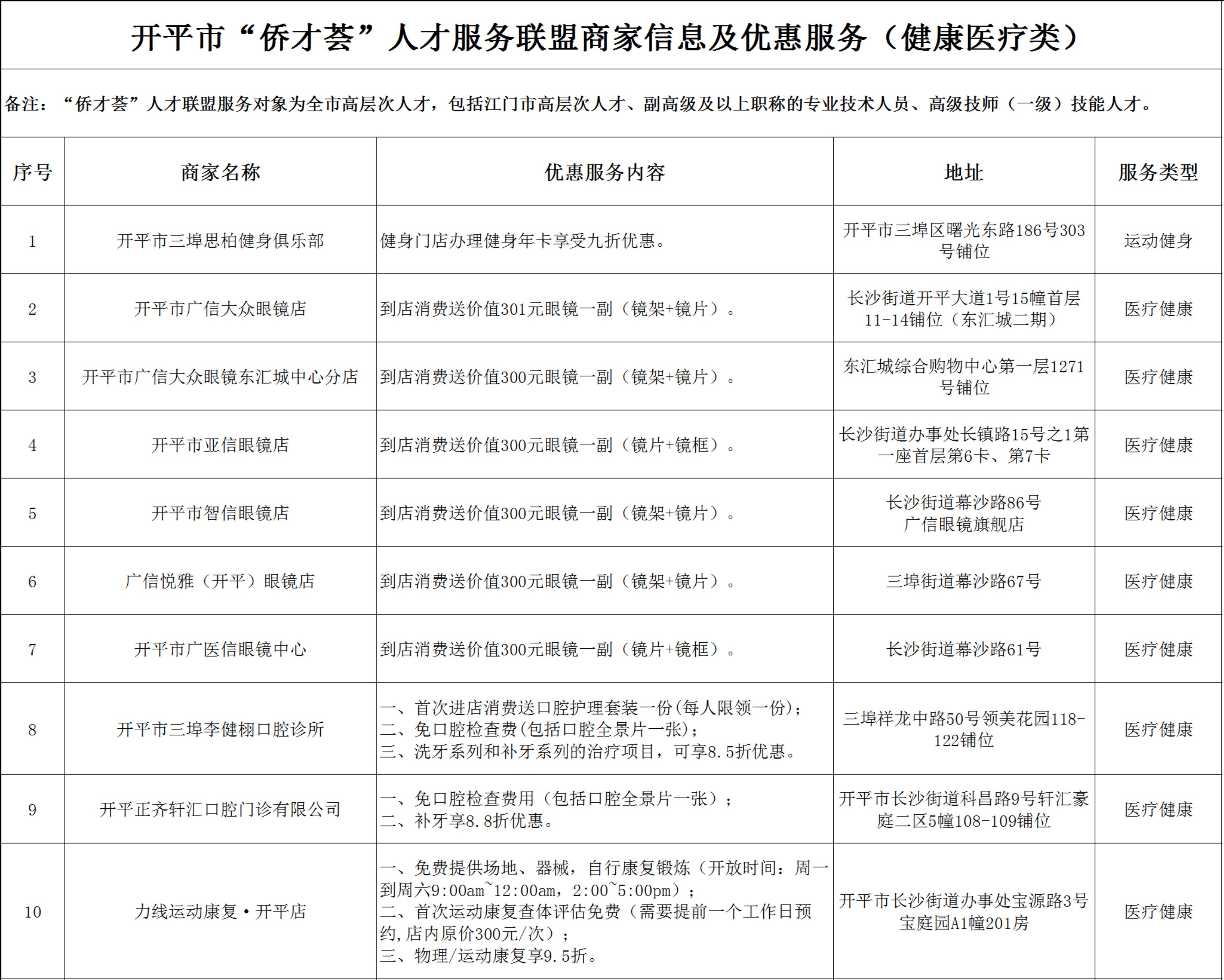 開(kāi)平市“僑才薈”人才服務(wù)聯(lián)盟商家信息及優(yōu)惠服務(wù)(健康醫(yī)療類)分表.xlsx