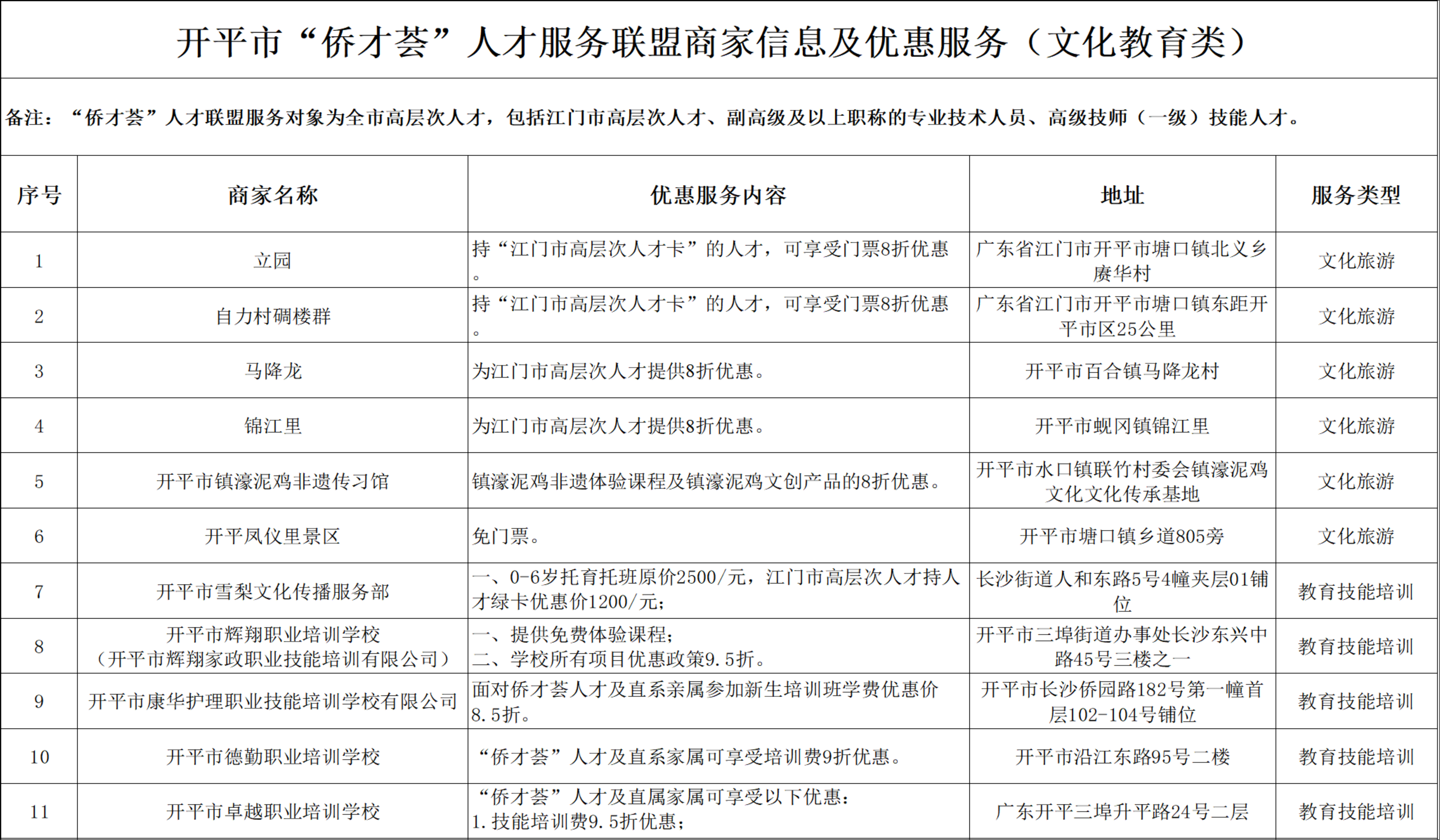 開(kāi)平市“僑才薈”人才服務(wù)聯(lián)盟商家信息及優(yōu)惠服務(wù)(文化教育類)分表.xlsx