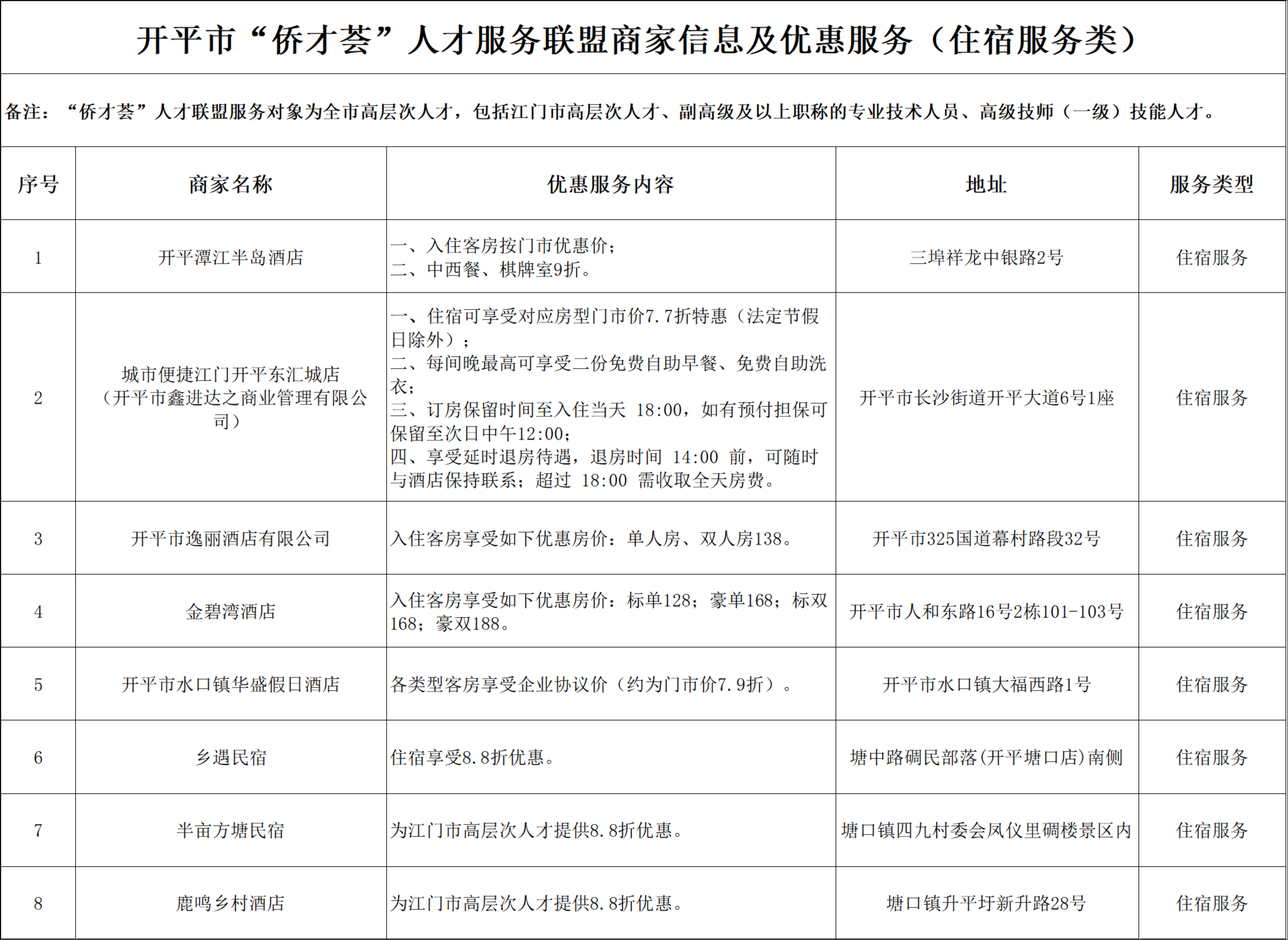開(kāi)平市“僑才薈”人才服務(wù)聯(lián)盟商家信息及優(yōu)惠服務(wù)(住宿服務(wù)類)分表.xlsx