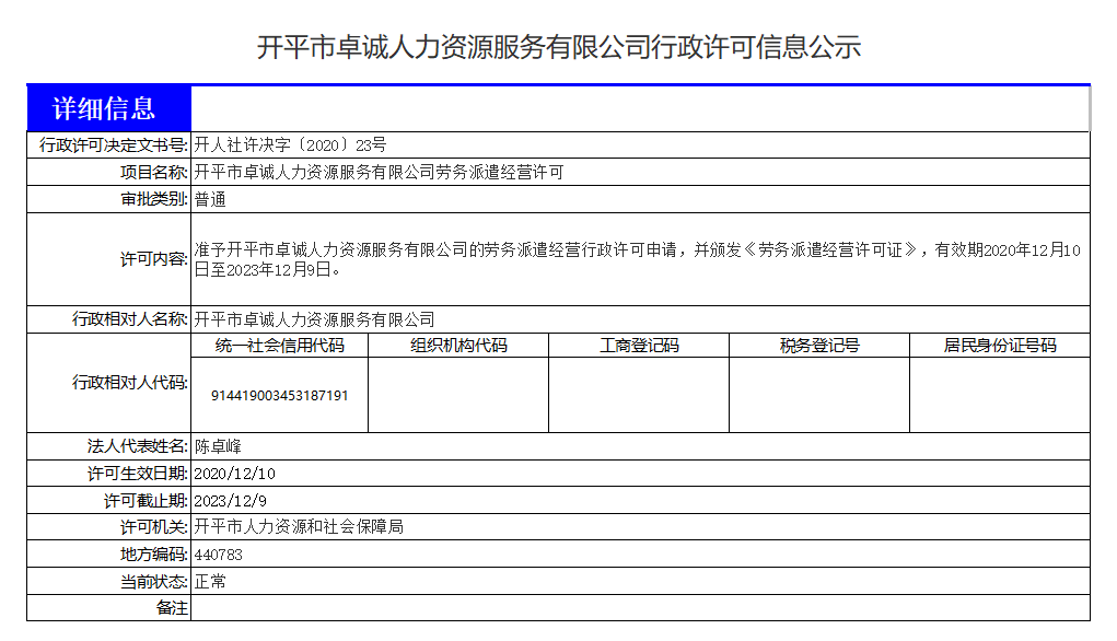 開(kāi)平市卓誠(chéng)人力資源服務(wù)有限公司行政許可信息公示