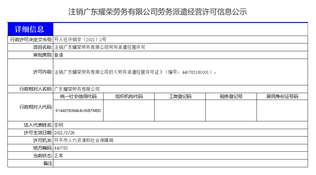 注銷廣東耀榮勞務(wù)有限公司勞務(wù)派遣經(jīng)營許可信息公示