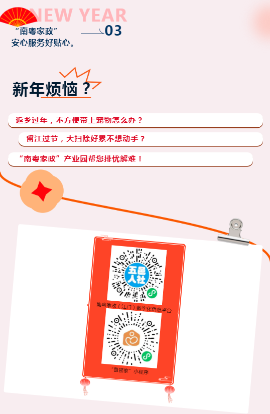 登錄南粵家政(江門)數(shù)字化信息平臺(tái),上百家優(yōu)質(zhì)家政企業(yè)提供保潔、月嫂、育嬰、養(yǎng)老等全方位家庭服務(wù)。打開(kāi)“邑管家”小程序,即可下單上門照顧寵物、上門代廚等新型家政服務(wù),讓您度過(guò)舒心春節(jié)!