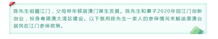 第二類:靈活就業(yè)人員(含無雇工的個體戶)。此類人員辦理廣東省就業(yè)登記證明,可自行選擇購買職工基本養(yǎng)老保險或職工基本醫(yī)療保險。持港澳臺居民居住證可在我市稅務(wù)大廳辦理參加企業(yè)職工基本養(yǎng)老保險或職工基本醫(yī)療保險登記。陳先生的妻子隨陳先生到江門居住生活,日常除了照顧家庭、教育子女外,還是獨立化妝師,她在辦理港澳臺居民居住證后,即可選擇參加職工基本養(yǎng)老保險或職工基本醫(yī)療保險。