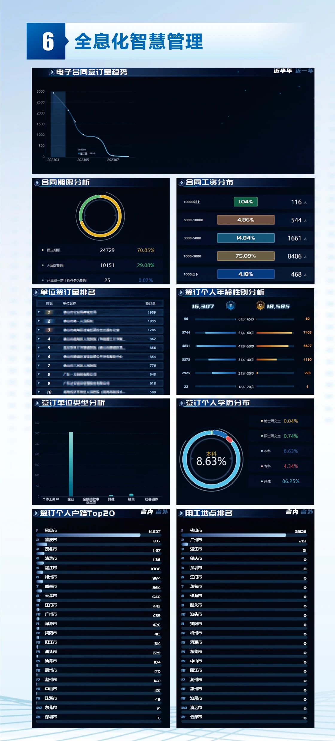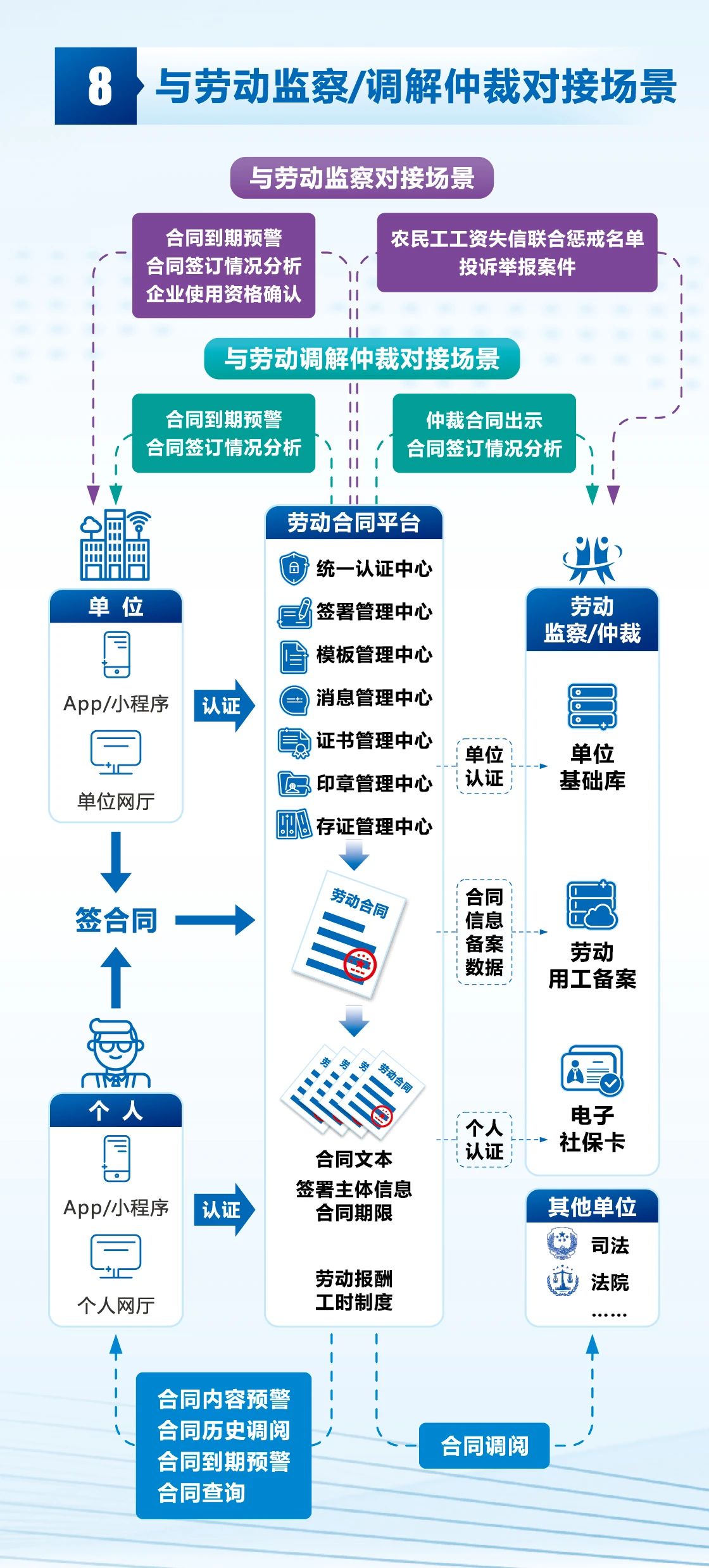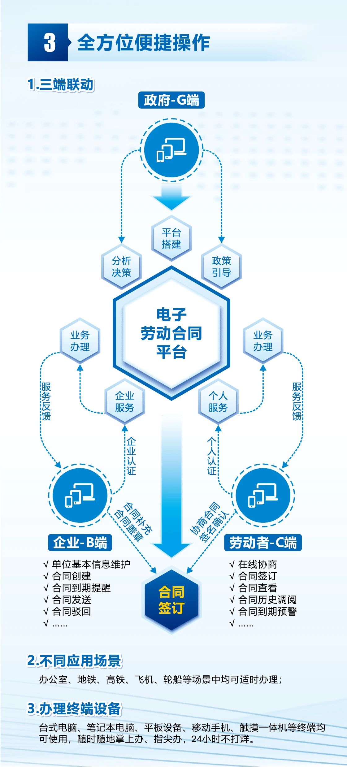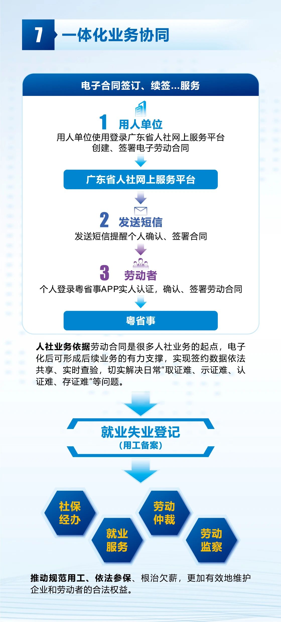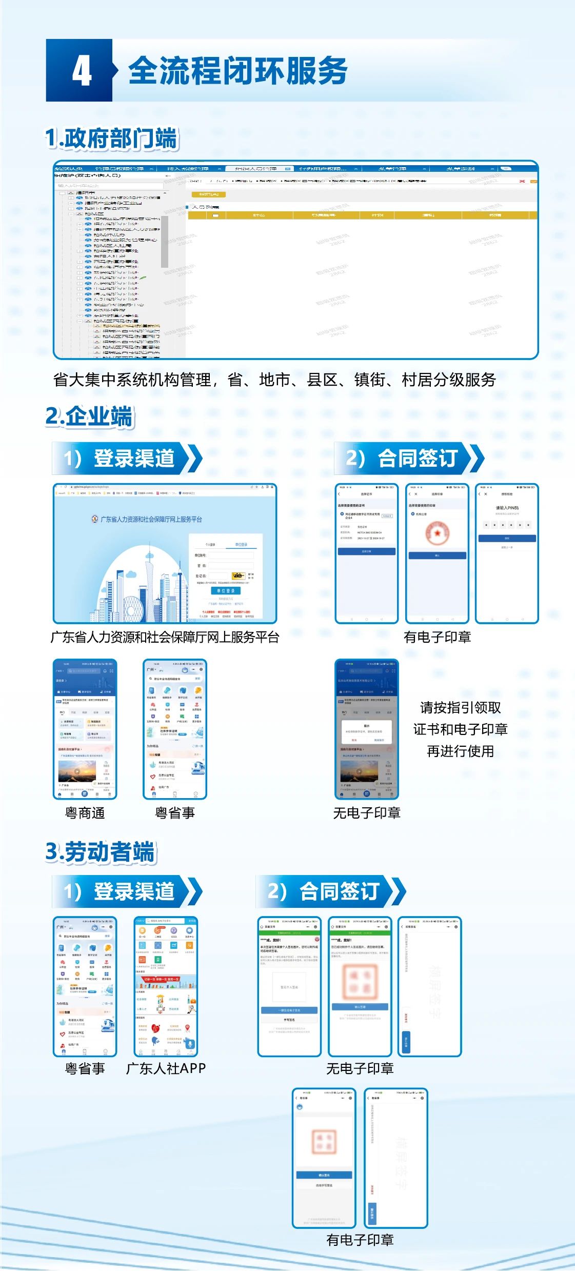 廣東省電子勞動(dòng)合同平臺(tái)為廣東省人力資源和社會(huì)保障廳開發(fā)建設(shè),是面向全省人社系統(tǒng)、用人單位和勞動(dòng)者提供全鏈條、全周期的電子勞動(dòng)合同簽訂、管理和服務(wù)的數(shù)字化平臺(tái)。該平臺(tái)充分運(yùn)用互聯(lián)網(wǎng)、區(qū)塊鏈、大數(shù)據(jù)、云計(jì)算、人工智能等信息技術(shù),集勞動(dòng)合同簽訂、審驗(yàn)、存貯、管理、監(jiān)測(cè)、統(tǒng)計(jì)分析等線上信息服務(wù)功能于一體,實(shí)現(xiàn)“線上簽約、鏈上管理、大數(shù)據(jù)應(yīng)用”的數(shù)字化工作模式,形成全數(shù)據(jù)上鏈和不可抵賴的“確權(quán)+維權(quán)”機(jī)制,打造人社部門、用人主體、勞動(dòng)者“三位一體”應(yīng)用端口,構(gòu)建省、市、縣(區(qū))、鎮(zhèn)街、村居“五級(jí)聯(lián)動(dòng)”數(shù)據(jù)管理應(yīng)用體系,延伸企業(yè)內(nèi)部全流程合同審批管理應(yīng)用場(chǎng)景,已初步實(shí)現(xiàn)與勞動(dòng)爭(zhēng)議調(diào)解仲裁、勞動(dòng)保障監(jiān)察執(zhí)法業(yè)務(wù)協(xié)同,下一步還將與就業(yè)失業(yè)登記、社會(huì)保險(xiǎn)經(jīng)辦等人社場(chǎng)景及外部業(yè)務(wù)聯(lián)動(dòng)對(duì)接,具有高度的便捷性、安全性、融合性、開放性特點(diǎn)。