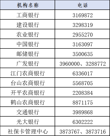 如有社??ㄏ嚓P(guān)疑問,可致電江門社??ü芾碇行幕蚋魃鐣?huì)保障卡合作銀行服務(wù)熱線咨詢:
