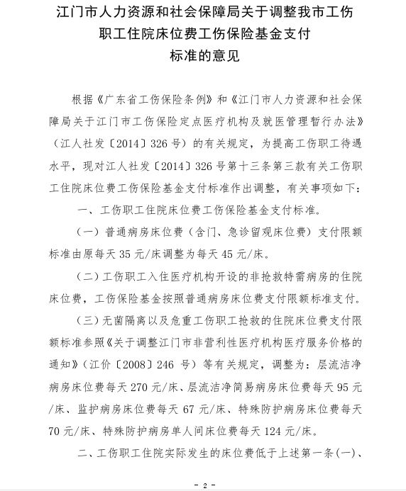 印發(fā)《江門市人力資源和社會(huì)保障局關(guān)于調(diào)整我市工傷職工住院床位費(fèi)工傷保險(xiǎn)基金支付標(biāo)準(zhǔn)的意見》的通知