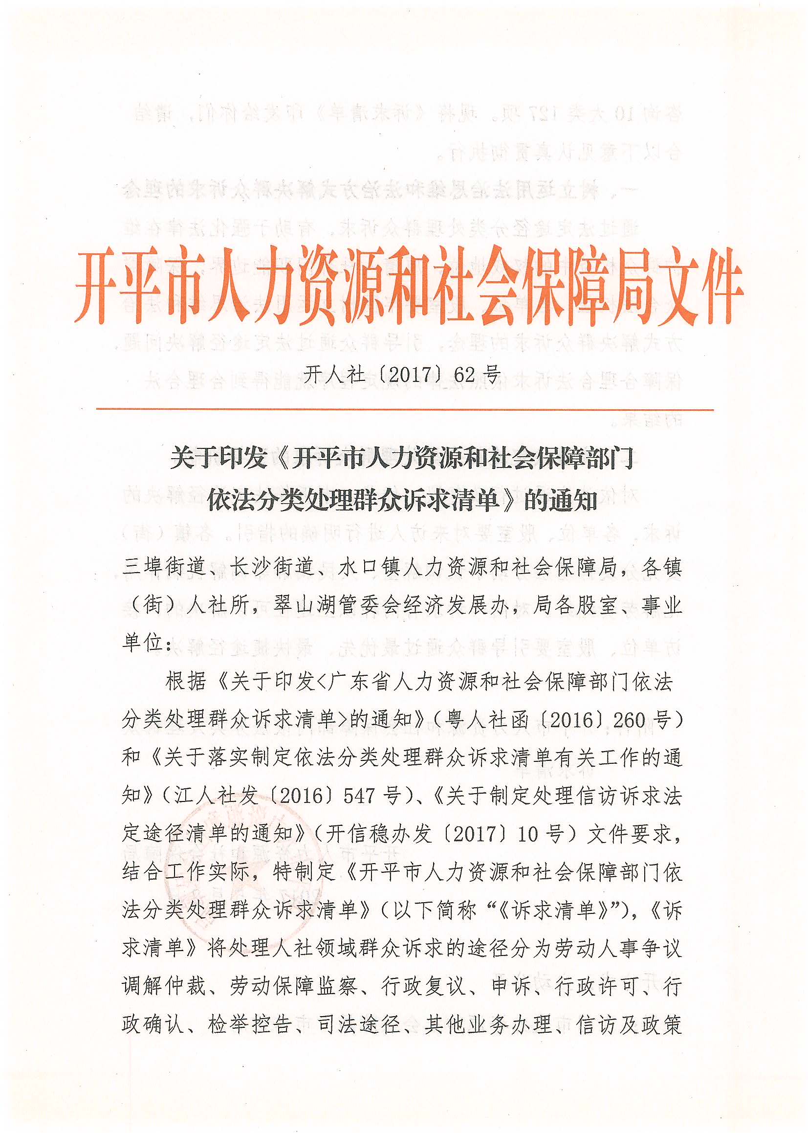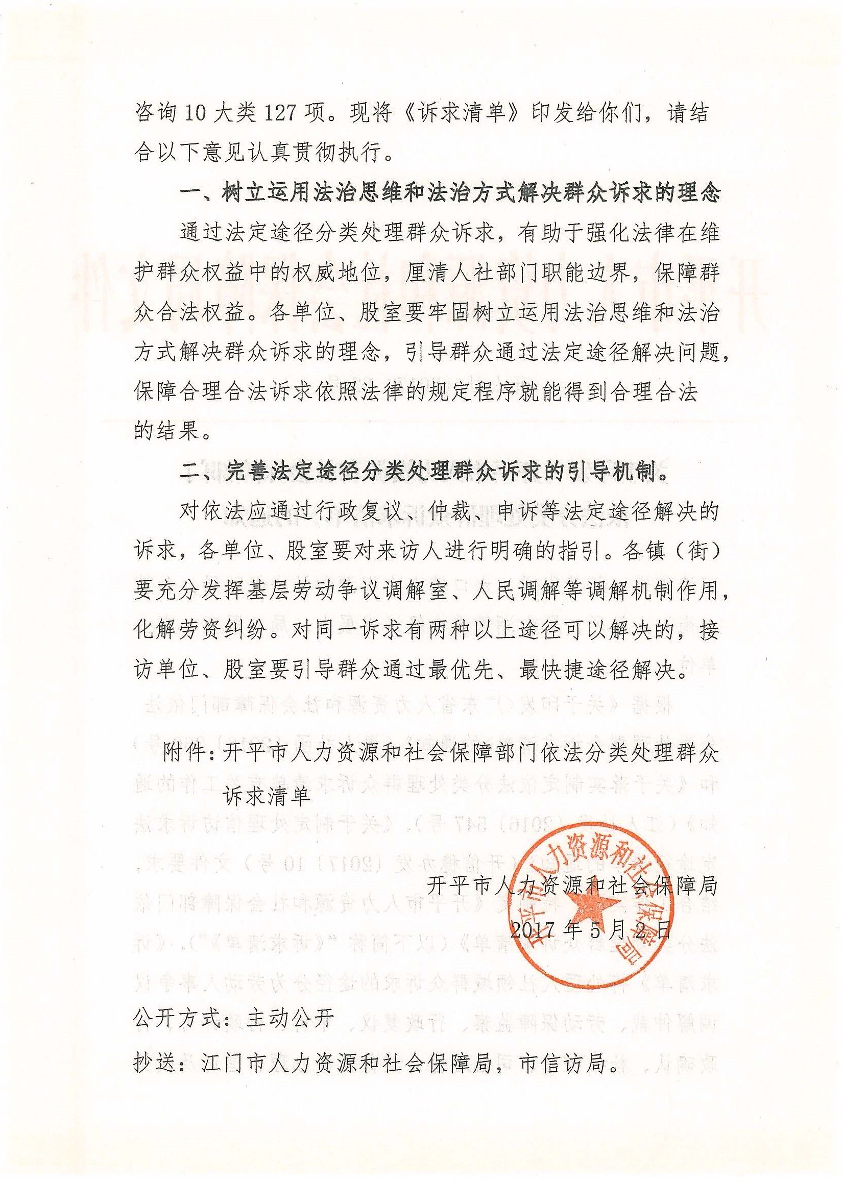 開人社【2017】62號(hào) 關(guān)于印發(fā)《開平市人力資源和社會(huì)保障部門依法分類處理群眾訴求清單》的通知