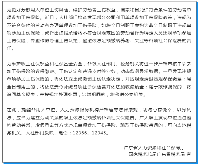 01-廣州市海珠區(qū)查處虛構(gòu)勞動(dòng)關(guān)系辦理單項(xiàng)參保行為 2024年1月,廣州市海珠區(qū)人社局通過(guò)核查參保人舉報(bào)線索,發(fā)現(xiàn)某人力資源服務(wù)公司通過(guò)“假外包、真掛靠”,將其他公司的全日制職工虛構(gòu)為本公司非全日制職工,簽訂虛假用工協(xié)議,違規(guī)辦理單項(xiàng)參加工傷保險(xiǎn)。目前,該公司已被當(dāng)?shù)厝松绮块T(mén)立案查處,并退回騙取的工傷保險(xiǎn)待遇。 02-韶關(guān)市曲江區(qū)查處違規(guī)為非特定人員辦理單項(xiàng)參保行為 2023年12月起,韶關(guān)市曲江區(qū)人社局按照省市統(tǒng)一部署,開(kāi)展工傷認(rèn)定風(fēng)險(xiǎn)排查整治專項(xiàng)行動(dòng),發(fā)現(xiàn)某公司在為建立勞動(dòng)關(guān)系職工辦理參保時(shí),將“臨近退休人員”“試用期人員”“臨時(shí)工”等群體錯(cuò)誤按“其他從業(yè)人員”類型單項(xiàng)參加工傷保險(xiǎn)。目前稅務(wù)機(jī)關(guān)已責(zé)令該公司糾正錯(cuò)誤參保關(guān)系,為存在勞動(dòng)關(guān)系的職工補(bǔ)繳各項(xiàng)社會(huì)保險(xiǎn)費(fèi),并按規(guī)定加收滯納金。 鏈接二:相關(guān)法律法規(guī) 單位違規(guī)單項(xiàng)參加工傷保險(xiǎn)、違規(guī)辦理社保業(yè)務(wù),可能會(huì)承擔(dān)多個(gè)法律責(zé)任。 01-弄虛作假辦理社保業(yè)務(wù)的法律責(zé)任 參保單位在工傷認(rèn)定申請(qǐng)中,如果提供虛假用工協(xié)議、虛假考勤資料等材料的,根據(jù)《廣東省社會(huì)保險(xiǎn)基金監(jiān)督條例》第六十一條處理處罰。 第六十一條 以欺詐、偽造證明材料、冒用他人證件、虛構(gòu)勞動(dòng)關(guān)系等手段辦理社會(huì)保險(xiǎn)業(yè)務(wù)的,社會(huì)保險(xiǎn)行政部門(mén)、社會(huì)保險(xiǎn)費(fèi)征收機(jī)構(gòu)、社會(huì)保險(xiǎn)經(jīng)辦機(jī)構(gòu)不予辦理,將有關(guān)情況記入其信用檔案;情節(jié)嚴(yán)重的,處涉案金額一倍以上三倍以下的罰款。以欺詐、偽造證明材料、虛構(gòu)勞動(dòng)關(guān)系或者其他手段騙取社會(huì)保險(xiǎn)待遇的,由社會(huì)保險(xiǎn)行政部門(mén)責(zé)令退還已騙取的社會(huì)保險(xiǎn)待遇,并處騙取金額二倍以上五倍以下的罰款。 02-未依法開(kāi)展人力資源服務(wù)的法律責(zé)任 人力資源服務(wù)機(jī)構(gòu)如果將用人單位職工改變?yōu)楸緳C(jī)構(gòu)的職工,串通損害職工合法權(quán)益的,根據(jù)《人力資源市場(chǎng)暫行條例》第四十三條規(guī)定處理處罰。 第三十條 經(jīng)營(yíng)性人力資源服務(wù)機(jī)構(gòu)接受用人單位委托提供人力資源服務(wù)外包的,不得改變用人單位與個(gè)人的勞動(dòng)關(guān)系,不得與用人單位串通侵害個(gè)人的合法權(quán)益。 第四十三條 違反本條例...第三十條...規(guī)定,...未依法開(kāi)展人力資源服務(wù)業(yè)務(wù)的,由人力資源社會(huì)保障行政部門(mén)責(zé)令改正;有違法所得的,沒(méi)收違法所得;拒不改正的,處1萬(wàn)元以上5萬(wàn)元以下的罰款;情節(jié)嚴(yán)重的,吊銷人力資源服務(wù)許可證;給個(gè)人造成損害的,依法承擔(dān)民事責(zé)任。違反其他法律、行政法規(guī)的,由有關(guān)主管部門(mén)依法給予處罰。 03-未按時(shí)足額繳納社會(huì)保險(xiǎn)費(fèi)的法律責(zé)任 如用人單位違規(guī)只為建立勞動(dòng)關(guān)系的職工選擇參加工傷保險(xiǎn),未按時(shí)足額繳納養(yǎng)老、醫(yī)療、失業(yè)等社會(huì)保險(xiǎn)費(fèi)的,根據(jù)《社會(huì)保險(xiǎn)法》第八十六條規(guī)定加收滯納金、罰款。 第八十六條 用人單位未按時(shí)足額繳納社會(huì)保險(xiǎn)費(fèi)的,由社會(huì)保險(xiǎn)費(fèi)征收機(jī)構(gòu)責(zé)令限期繳納或者補(bǔ)足,并自欠繳之日起,按日加收萬(wàn)分之五的滯納金;逾期仍不繳納的,由有關(guān)行政部門(mén)處欠繳數(shù)額一倍以上三倍以下的罰款。 04-騙保的法律責(zé)任 參保單位通過(guò)將發(fā)生工傷的“老職工”偽造為新入職職工參保,或者在申領(lǐng)工傷保險(xiǎn)待遇時(shí)提供虛假墊付醫(yī)療費(fèi)用說(shuō)明等方式,騙取工傷保險(xiǎn)待遇的,根據(jù)《社會(huì)保險(xiǎn)法》第八十八條處罰,達(dá)到規(guī)定金額的,依法追究刑事責(zé)任。 第八十八條 以欺詐、偽造證明材料或者其他手段騙取社會(huì)保險(xiǎn)待遇的,由社會(huì)保險(xiǎn)行政部門(mén)責(zé)令退回騙取的社會(huì)保險(xiǎn)金,處騙取金額二倍以上五倍以下的罰款。 第九十四條 違反本法規(guī)定,構(gòu)成犯罪的,依法追究刑事責(zé)任。 解讀:開(kāi)平市人力資源和社會(huì)保障局執(zhí)法一大隊(duì) 咨詢方式:0750-2257325