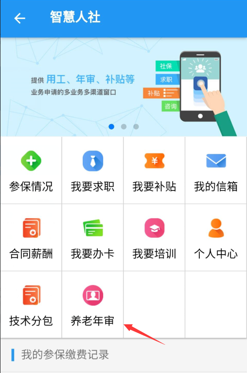 (四)綁定成功后進入首頁,點擊“養(yǎng)老年審”功能按鈕進入年審界面。