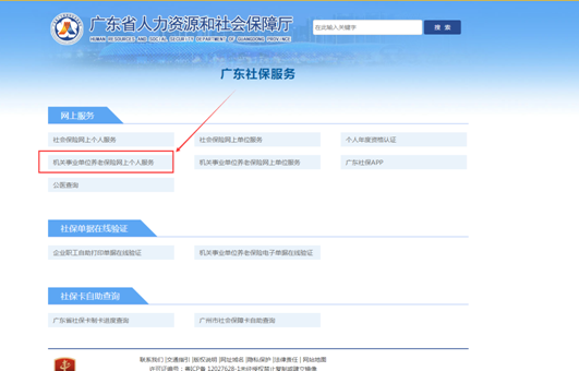 一、按以下網(wǎng)址登錄“廣東政務(wù)服務(wù)網(wǎng)”關(guān)聯(lián)的“廣東省機關(guān)事業(yè)單位養(yǎng)老保險網(wǎng)上服務(wù)系統(tǒng)”