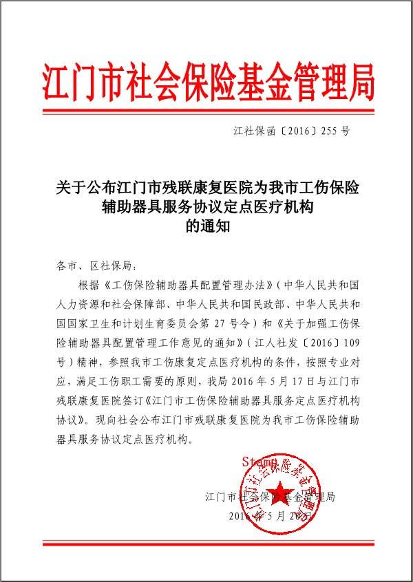 關(guān)于公布江門市殘聯(lián)康復(fù)醫(yī)院為我市工傷保險輔助器具服務(wù)協(xié)議定點醫(yī)療機構(gòu)的通知