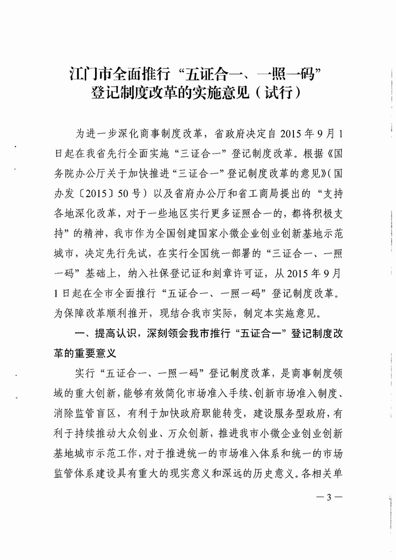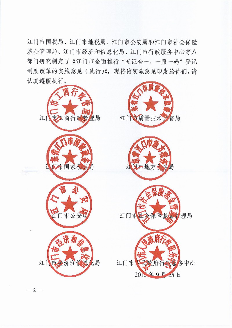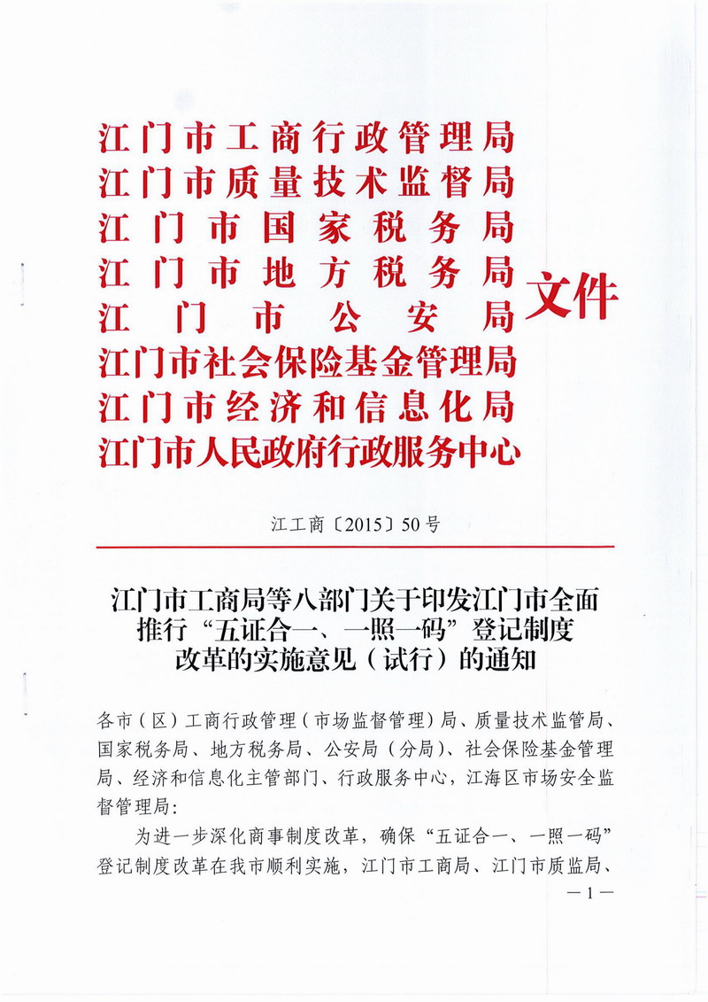 江門市工商局等八部門關(guān)于印發(fā)江門市全面推行“五證合一、一照一碼”登記制度改革的實(shí)施意見(jiàn)(試行)的通知