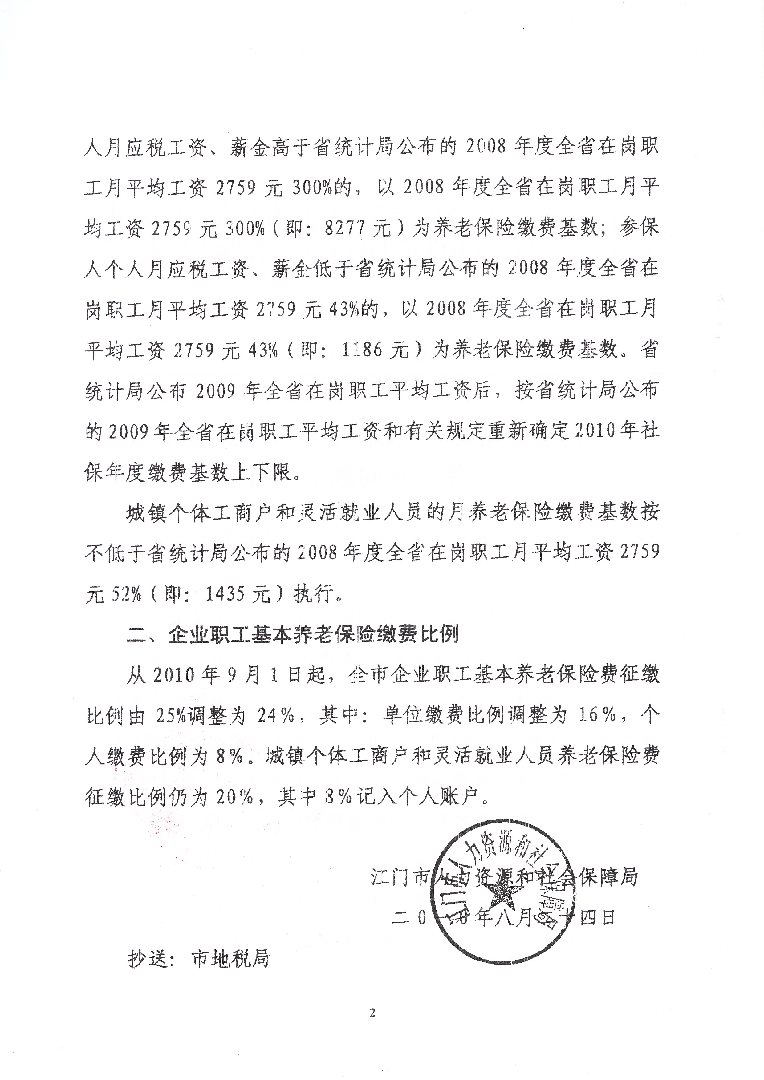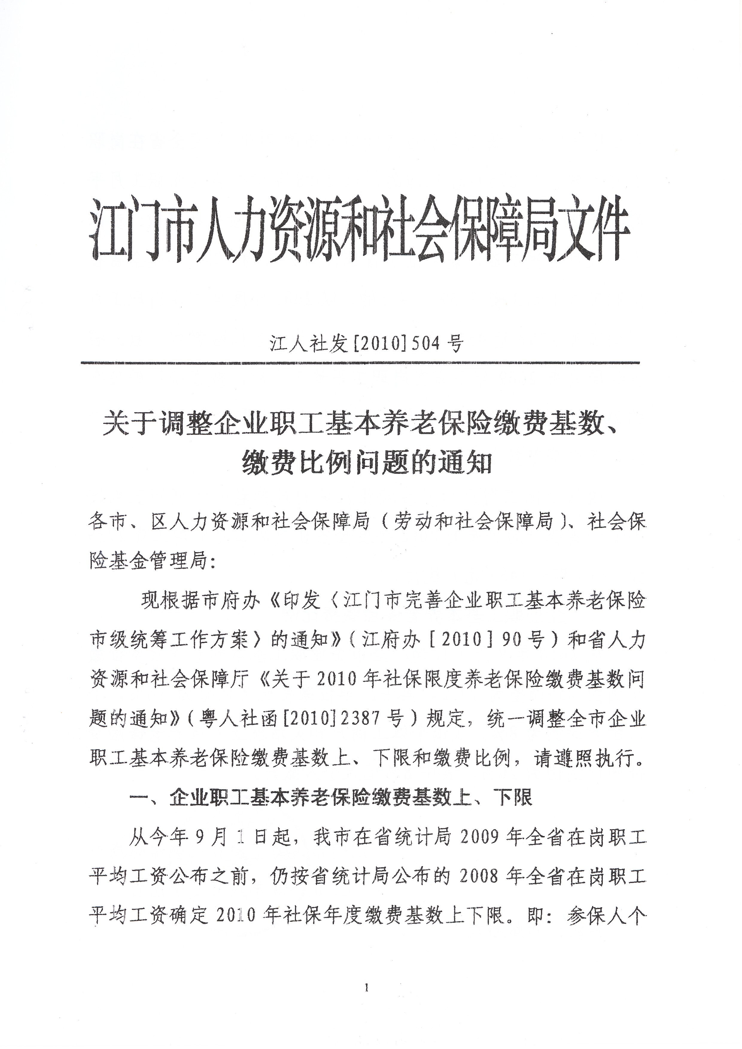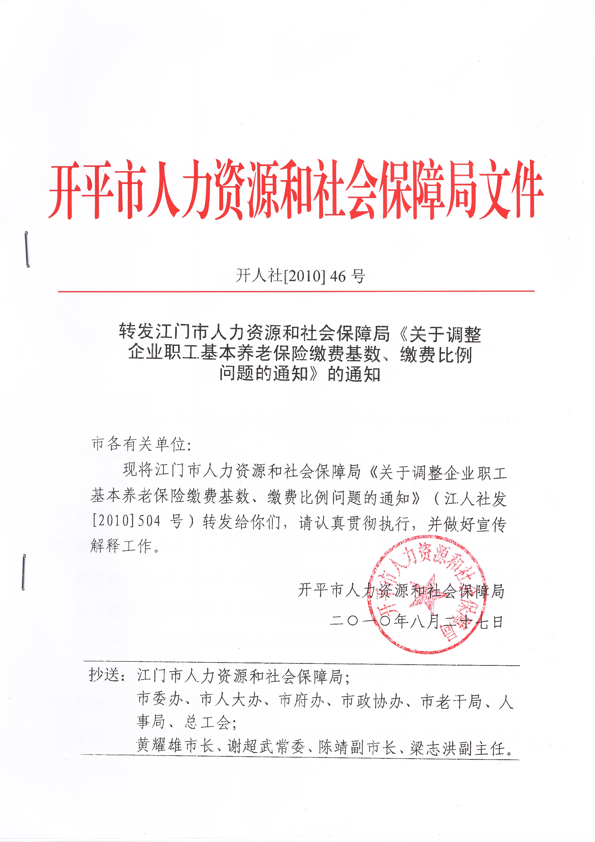 轉(zhuǎn)發(fā)江門市人力資源和社會保障局《關(guān)于調(diào)整企業(yè)職工基本養(yǎng)老保險繳費基數(shù)、繳費比例問題的通知》的通知(開人社[2010]46號)