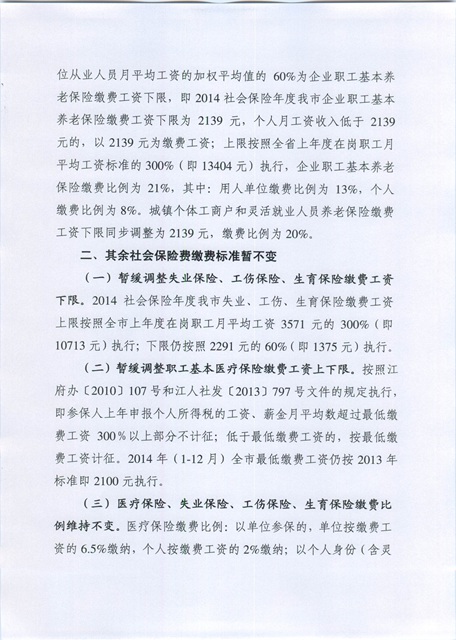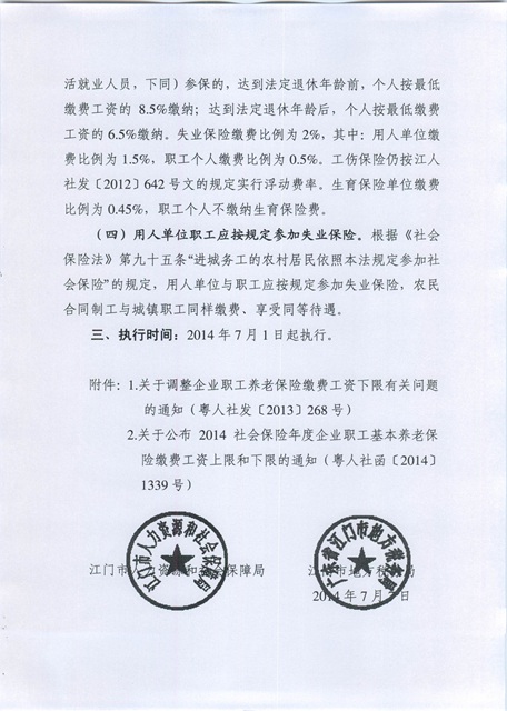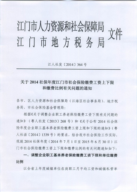 關(guān)于2014社保年度江門市社會保險繳費(fèi)工資上下限和繳費(fèi)比例有關(guān)問題的通知