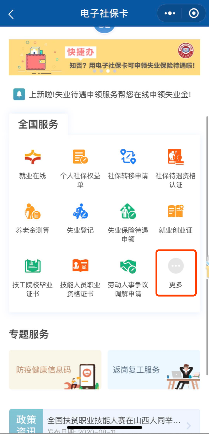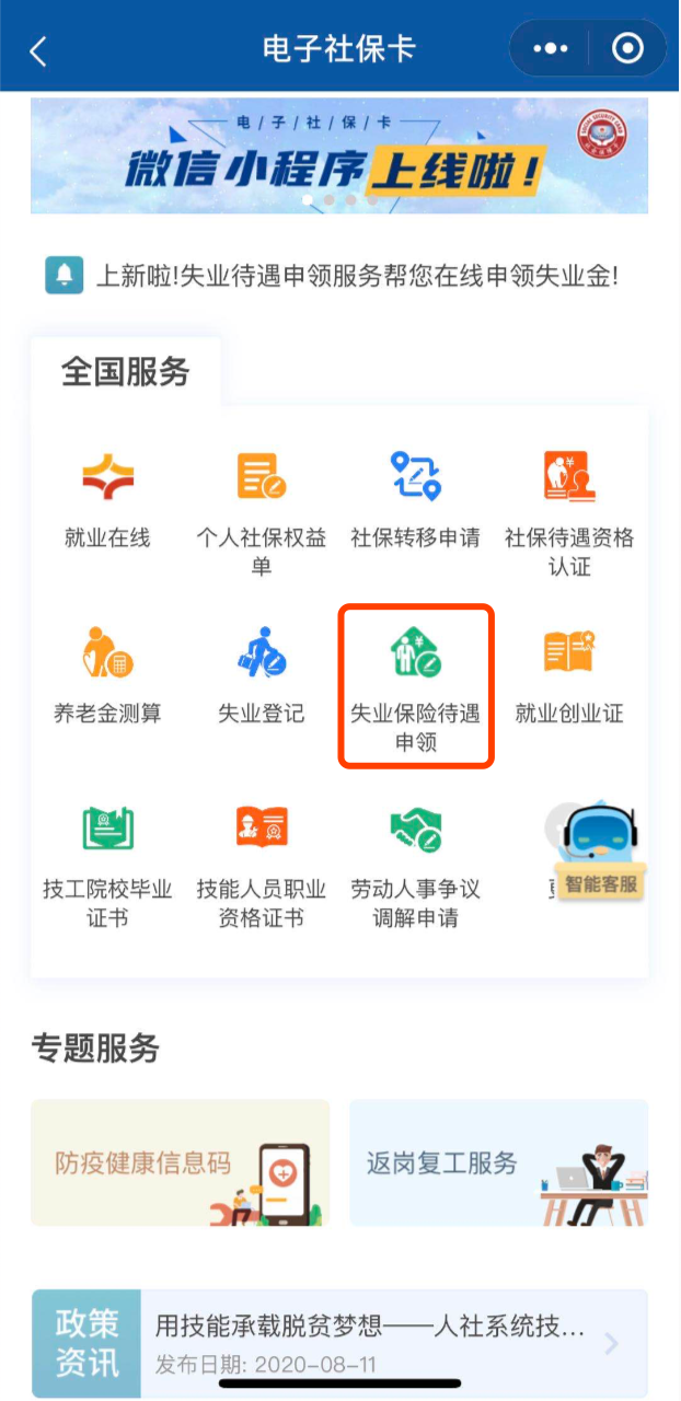 關(guān)于【失業(yè)登記】 Q 哪些人可以辦理失業(yè)登記? 所有勞動年齡內(nèi)、有勞動能力、有就業(yè)需求、處于無業(yè)狀態(tài)的城鄉(xiāng)勞動者均可以進(jìn)行失業(yè)登記。 例如,從各類學(xué)校畢業(yè)肄業(yè)的學(xué)生、與企業(yè)解除或終止勞動關(guān)系的勞動者、承包土地被征用的農(nóng)民、從事一定收入的勞動但月收入低于當(dāng)?shù)刈畹蜕畋U蠘?biāo)準(zhǔn)的人員等。 Q 失業(yè)登記怎么辦理? 1 進(jìn)入【國務(wù)院客戶端小程序】→【電子社???/a>】→【查看電子社??ㄐ畔ⅰ?。 2 點(diǎn)擊失業(yè)登記,填寫申請人基本信息、失業(yè)相關(guān)信息和求職相關(guān)信息。 3 在【全國服務(wù)】→【更多】→【失業(yè)登記審核結(jié)果】中,可查詢之前提交申請的審核結(jié)果。 關(guān)于【失業(yè)保險待遇申領(lǐng)】 Q 哪些人可以領(lǐng)失業(yè)保險金、失業(yè)補(bǔ)助金? 失業(yè)保險金: 按規(guī)定參加失業(yè)保險,所在單位和本人已履行繳費(fèi)義務(wù)滿1年、非本人意愿中斷就業(yè)、已辦理失業(yè)登記并有求職要求的失業(yè)人員。 失業(yè)補(bǔ)助金: ● 按規(guī)定參加失業(yè)保險,所在單位和本人已履行繳費(fèi)義務(wù)不足1年的失業(yè)人員, ● 參保繳費(fèi)滿1年但因個人原因解除勞動合同的失業(yè)人員, ● 領(lǐng)取失業(yè)保險金期滿仍未就業(yè)的失業(yè)人員。 Q 失業(yè)保險金、補(bǔ)助金怎么申領(lǐng)? 1 進(jìn)入【國務(wù)院客戶端小程序】→【電子社???/a>】→【查看電子社保卡信息】。 2 點(diǎn)擊失業(yè)保險待遇申領(lǐng),查詢所申領(lǐng)參保地是否開通失業(yè)保險金或失業(yè)補(bǔ)助金網(wǎng)上申領(lǐng)服務(wù)。目前全國所有?。▍^(qū)、市)失業(yè)保險金和失業(yè)補(bǔ)助金均已開通統(tǒng)一申領(lǐng)服務(wù)。 3 凡已開通服務(wù)的地區(qū),可以點(diǎn)擊失業(yè)保險金或失業(yè)補(bǔ)助金“去申請”按鈕,核實(shí)或錄入?yún)⒈5?、銀行賬號等信息,就能完成申請。 4 點(diǎn)擊失業(yè)保險金或失業(yè)補(bǔ)助金“查看詳情”按鈕,可以查詢申請的審核結(jié)果。經(jīng)核查符合申領(lǐng)條件的,就可以通過登記的銀行賬戶領(lǐng)到失業(yè)保險待遇啦。 掃描或點(diǎn)擊下方小程序碼, 領(lǐng)失業(yè)保險金、失業(yè)補(bǔ)助金