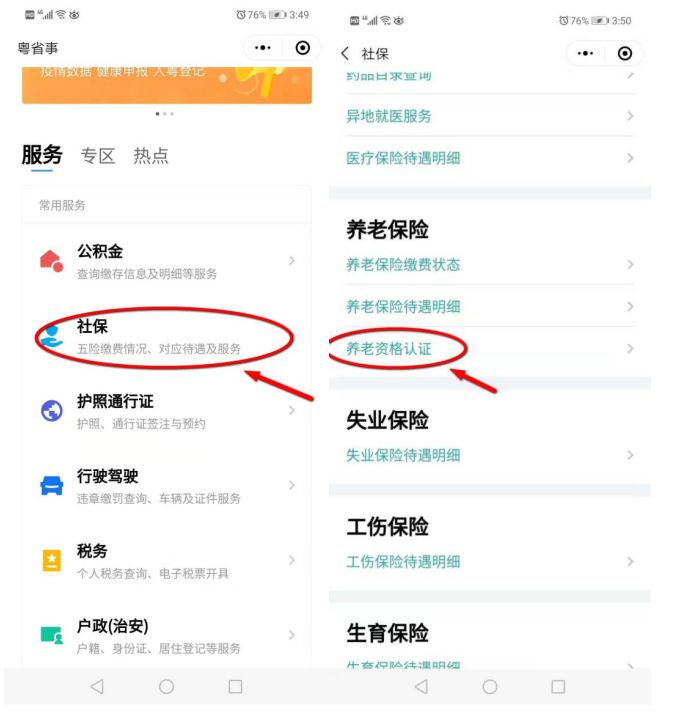 1.可辦理:企業(yè)職工養(yǎng)老保險待遇資格認證(即退休年審)業(yè)務。2.操作指引:參保人通過智能手機在微信上搜索“粵省事”小程序-在服務專區(qū)選擇“社?!卑鍓K-點擊“登錄”,通過個人身份認證后,選擇“養(yǎng)老保險”-點擊“養(yǎng)老資格認證”-點擊“城鎮(zhèn)職工社保”-點擊“本人辦理”或“為他人代辦”,并輸入對應的姓名和身份證號碼-進行人臉識別認證。