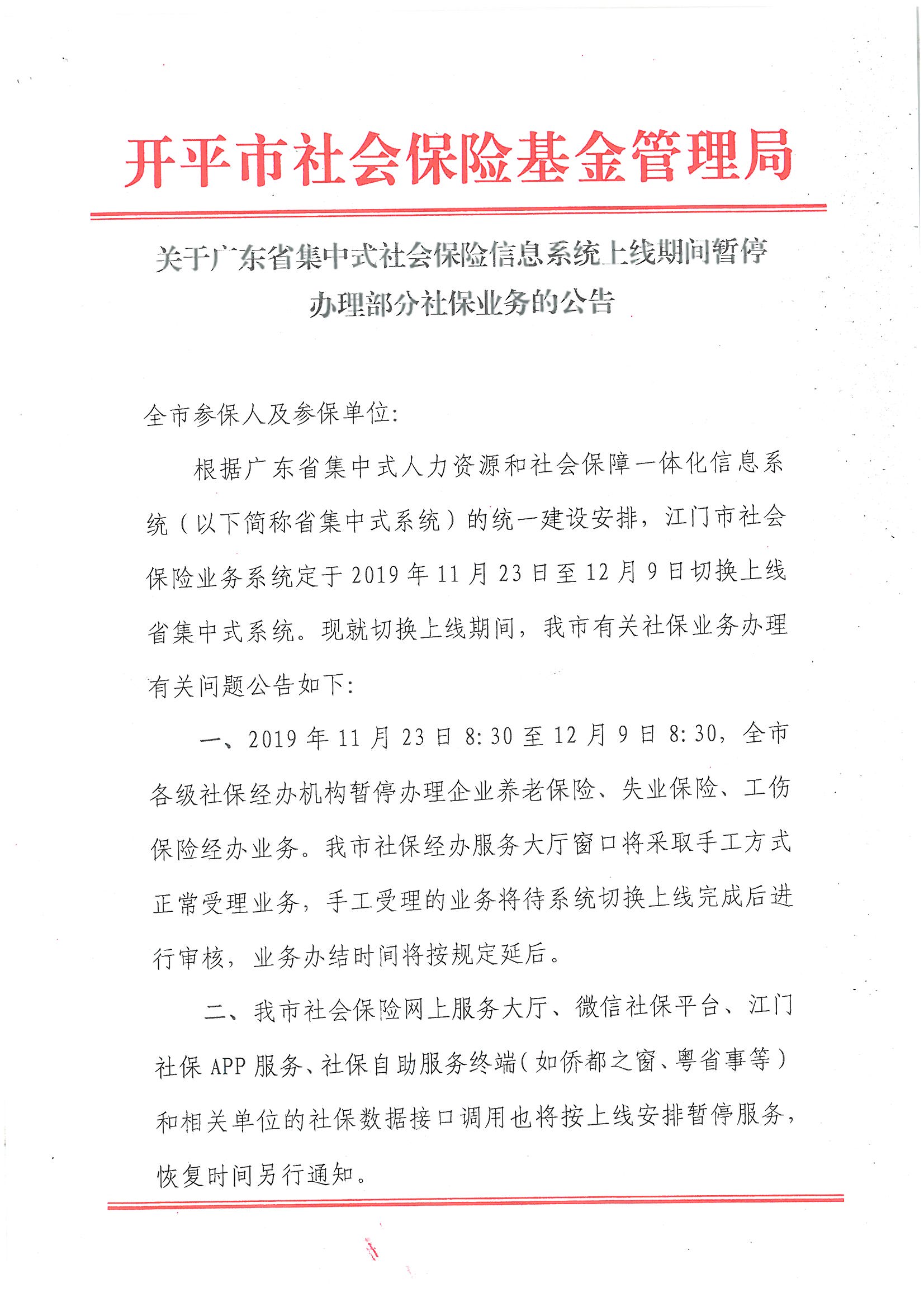 關(guān)于廣東省中式社會(huì)保險(xiǎn)信息系統(tǒng)上線期間暫停辦理部分社保業(yè)務(wù)的公告