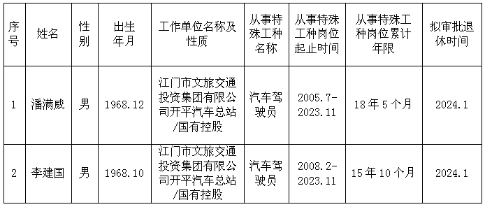 根據(jù)《關(guān)于規(guī)范特殊工種提前退休審批工作有關(guān)問題的通知》(粵勞社〔2002〕136號(hào))、《轉(zhuǎn)發(fā)人力資源社會(huì)保障部關(guān)于進(jìn)一步加強(qiáng)企業(yè)特殊工種提前退休管理工作的通知》(粵人社函〔2018〕4037號(hào))的有關(guān)規(guī)定,經(jīng)初步審核,潘滿威等2人符合特殊工種提前退休條件,擬同意辦理提前退休手續(xù),現(xiàn)將有關(guān)情況予以公示(見附表)。
