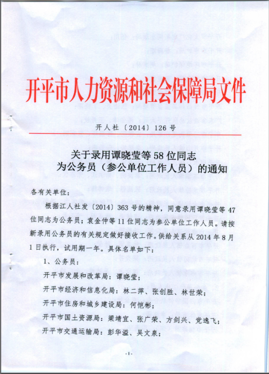 關于錄用譚曉瑩等58位同志為公務員(參公單位工作人員)的通知