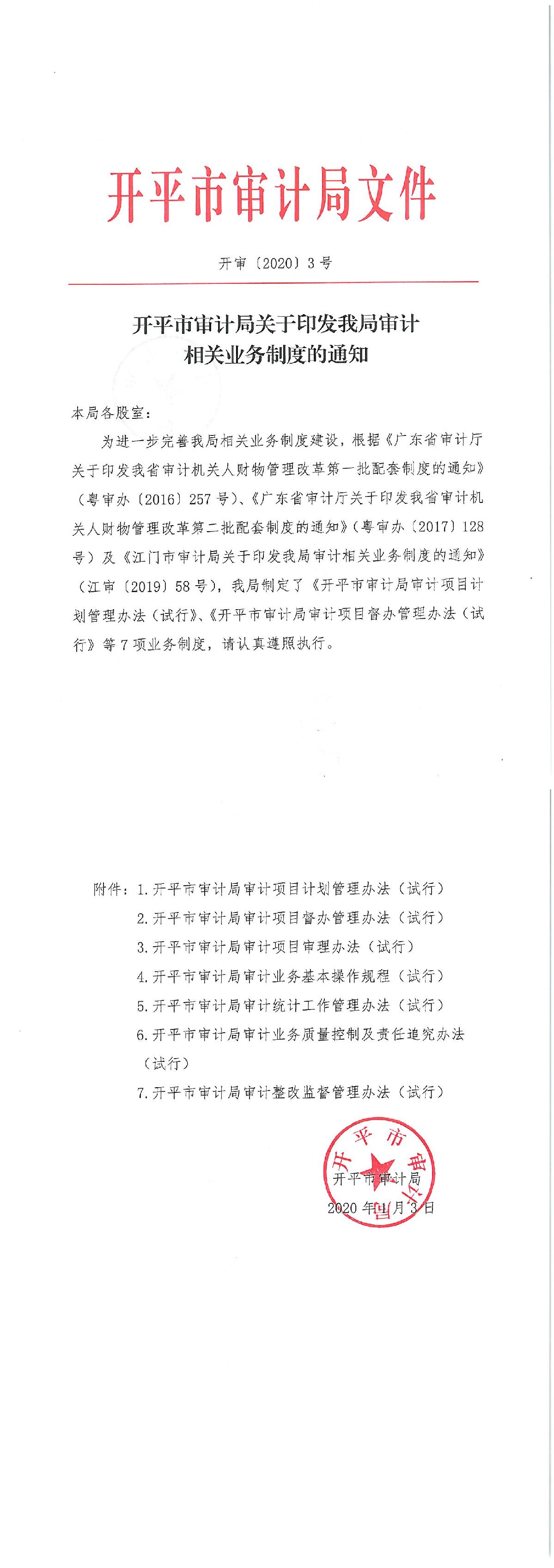 開(kāi)審[2020]3號(hào) 開(kāi)平市審計(jì)局關(guān)于印發(fā)我局審計(jì)相關(guān)業(yè)務(wù)制度的通知