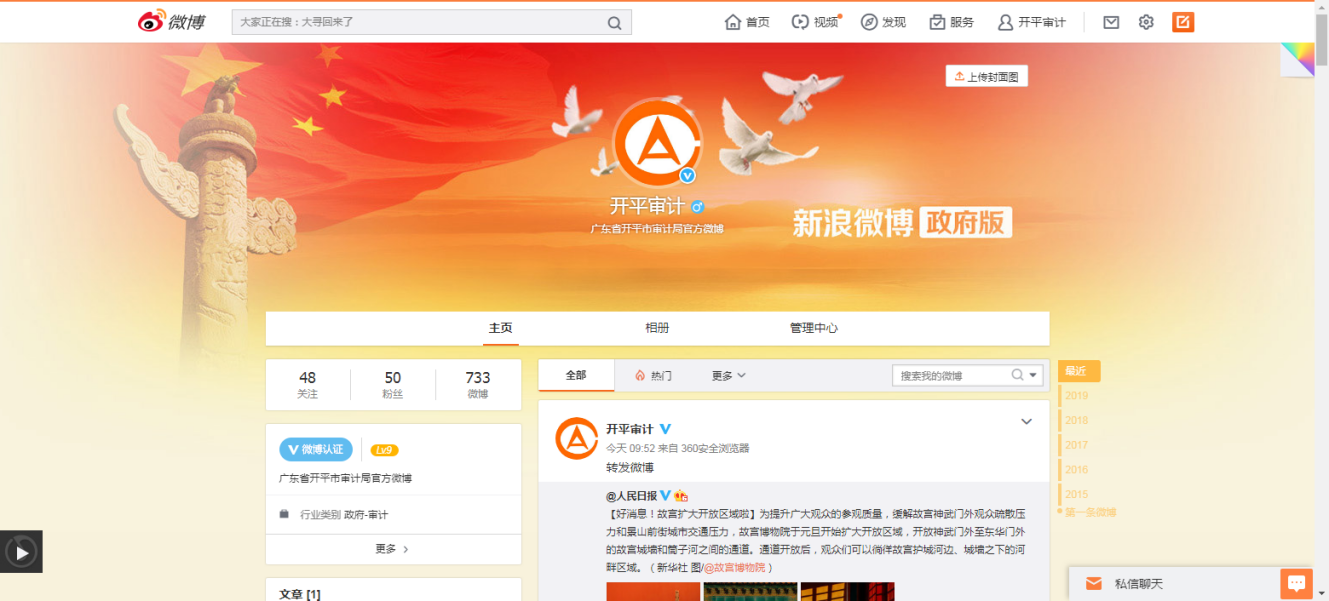 “開(kāi)平審計(jì)”官方微博共發(fā)布微博200條。