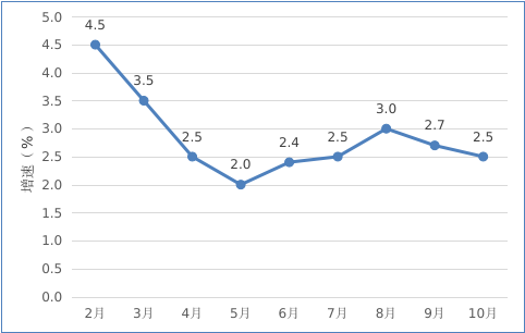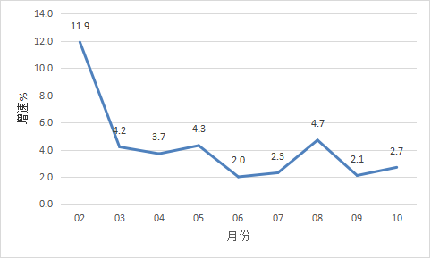 2022年2月以來(lái)我市規(guī)模以上工業(yè)增加值情況 二、投資 1-10月,全市完成固定資產(chǎn)投資同比下降13.2%。從分經(jīng)濟(jì)類型看,國(guó)有投資增長(zhǎng)39.2%;民間投資下降19.3%。分產(chǎn)業(yè)看,第一產(chǎn)業(yè)投資下降24.2%;第二產(chǎn)業(yè)投資增長(zhǎng)3.3%,其中工業(yè)投資增長(zhǎng)3.3%;第三產(chǎn)業(yè)投資下降23.3%,其中房地產(chǎn)投資下降35.6%。 三、消費(fèi)市場(chǎng) 1-10月,我市完成社會(huì)消費(fèi)品零售總額154.08億元,同比增長(zhǎng)2.5%。 圖二