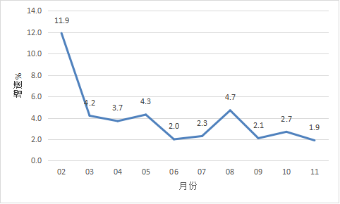 開平市1-11月經(jīng)濟(jì)運(yùn)行簡(jiǎn)況 1-11月,全市主要經(jīng)濟(jì)指標(biāo)運(yùn)行簡(jiǎn)況如下: 一、工業(yè)生產(chǎn) 1-11月,開平規(guī)模以上工業(yè)企業(yè)累計(jì)完成工業(yè)增加值115.99億元,同比增長(zhǎng)1.9%。 分經(jīng)濟(jì)類型看,股份制企業(yè)增長(zhǎng)0.1%;外商及港澳臺(tái)商投資企業(yè)增長(zhǎng)3.4%;私營(yíng)企業(yè)下降0.3%。分門類看,采礦業(yè)增加值增長(zhǎng)17.5%,制造業(yè)增加值增長(zhǎng)2.1%,電力、熱力、燃?xì)饧八a(chǎn)和供應(yīng)業(yè)增加值下降10.0%。 1-11月全市工業(yè)用電量下降6.1%。 圖一