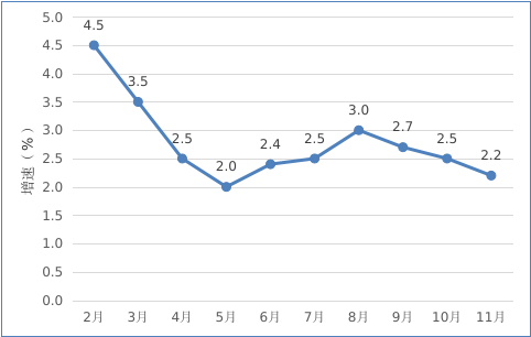 2022年2月以來我市規(guī)模以上工業(yè)增加值情況 二、投資 1-11月,全市完成固定資產(chǎn)投資同比下降16.1%。從分經(jīng)濟(jì)類型看,國有投資增長(zhǎng)36.0%;民間投資下降21.8%。分產(chǎn)業(yè)看,第一產(chǎn)業(yè)投資下降34.5%;第二產(chǎn)業(yè)投資增長(zhǎng)5.1%,其中工業(yè)投資增長(zhǎng)5.1%;第三產(chǎn)業(yè)投資下降28.4%,其中房地產(chǎn)投資下降40.2%。 三、消費(fèi)市場(chǎng) 1-11月,我市完成社會(huì)消費(fèi)品零售總額168.75億元,同比增長(zhǎng)2.2%。 圖二