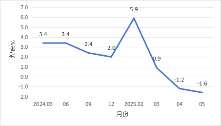 2024年3月以來開平市規(guī)模以上工業(yè)增加值增速 二、投資 1-5月,全市固定資產(chǎn)完成投資同比下降26.6%。分經(jīng)濟(jì)類型看,國有投資下降15.7%;港澳臺和外商投資增長3.4%;民間投資下降22.7%。 三、消費市場 1-5月,我市完成社會消費品零售總額68.88億元,同比下降0.8%。 圖2