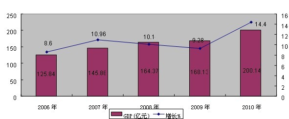 2010年,全市國民經(jīng)濟繼續(xù)保持健康發(fā)展,經(jīng)濟增長速度適度加快,經(jīng)濟運行質(zhì)量明顯提高。初步核算全年實現(xiàn)生產(chǎn)總值200.14億元(當年價),比上年增長14.4%。其中:第一產(chǎn)業(yè)增加值20.09億元,增長4.2%;第二產(chǎn)業(yè)增加值103.66億元,增長20.5 %;第三產(chǎn)業(yè)增加值76.39億元,增長9.0%。第一、二、三產(chǎn)業(yè)增加值的比重為10.0 : 51.8 : 38.2。按戶籍人口計人均生產(chǎn)總值29105元。
