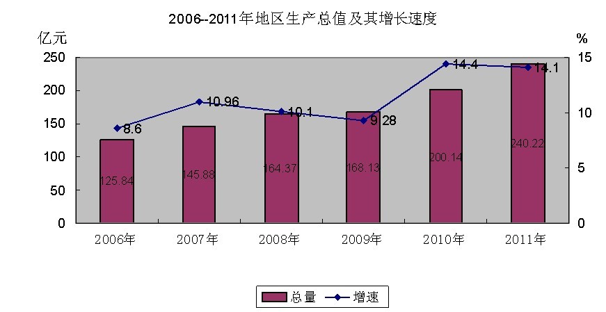 2011年,全市國民經(jīng)濟繼續(xù)保持健康發(fā)展,經(jīng)濟增長均速運行。初步核算全年實現(xiàn)生產(chǎn)總值240.22億元(當年價),比上年增長14.1%。其中:第一產(chǎn)業(yè)增加值25.35億元,增長2.9%;第二產(chǎn)業(yè)增加值132.34億元,增長20.7 %;第三產(chǎn)業(yè)增加值82.53億元,增長7.9%。第一、二、三產(chǎn)業(yè)增加值的比重為10.55 : 55.09 : 34.36。人均生產(chǎn)總值34381元。