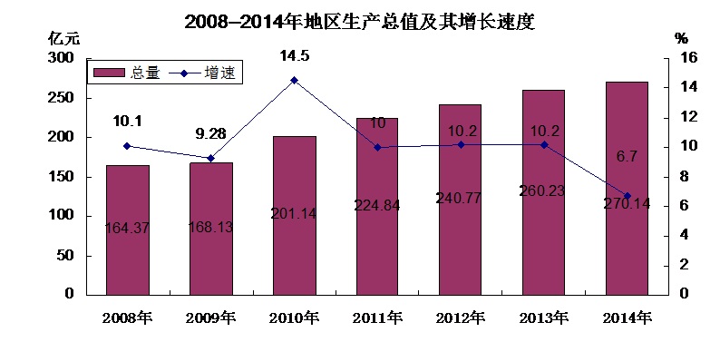 開平市二○一四年 國民經(jīng)濟(jì)和社會發(fā)展統(tǒng)計公報 (2015年 4 月 23 日) 開平市統(tǒng)計局 2014年,開平市委、市政府帶領(lǐng)全市人民緊緊圍繞“轉(zhuǎn)作風(fēng)、敢擔(dān)當(dāng)、求實(shí)效”的工作主線,積極應(yīng)對困難與挑戰(zhàn),開拓進(jìn)取,在錯綜復(fù)雜的國內(nèi)外經(jīng)濟(jì)形勢中實(shí)現(xiàn)經(jīng)濟(jì)發(fā)展穩(wěn)中向好,社會各項(xiàng)事業(yè)持續(xù)健康發(fā)展。 一、綜合 初步核算,2014年全市實(shí)現(xiàn)地區(qū)生產(chǎn)總值270.14億元(當(dāng)年價),比上年增長6.7%。其中:第一產(chǎn)業(yè)增加值27.36億元,增長2.8%;第二產(chǎn)業(yè)增加值133.49億元,增長9.3%;第三產(chǎn)業(yè)增加值109.29億元,增長3.4%。第一、二、三產(chǎn)業(yè)增加值的比重為10.13: 49.41 :40.46。人均生產(chǎn)總值 38329 元。 圖1: 二、農(nóng)業(yè) 全年實(shí)現(xiàn)農(nóng)業(yè)總產(chǎn)值48.43億元,發(fā)展速度101.3%。全年糧食作物播種面積67.90萬畝,比上年下降0.03%。其中:水稻種植面積60.36萬畝,比上年下降0.42%。 全年糧食總產(chǎn)量22.52萬噸,比上年增長2.70%,其中:稻谷20.81萬噸,比上年增長3.02%。 圖2: 全市跡地更新造林面積4.08萬畝,比上年下降39.39%;木材砍伐18.26萬立方米,比上年增長21.50%。 畜牧業(yè)肉類總產(chǎn)量7.25萬噸,比上年下降1.4%;全年生豬出欄量59.01萬頭,比上年增長20.74%;家禽出欄量2230.53萬只,比上年下降17.12%;禽蛋全年總產(chǎn)量1.23萬噸,比上年增長2.86%;水產(chǎn)品產(chǎn)量5.00萬噸,比上年增長7.30%。 三、工業(yè)和建筑業(yè) 2014年,全市規(guī)模以上工業(yè)企業(yè)245家,規(guī)模以上工業(yè)增加值比上年增長10.3%,工業(yè)總產(chǎn)值比上年增長19.75 %。工業(yè)總產(chǎn)值中,按輕重工分:輕工業(yè)增長19.16%,重工業(yè)增長20.33%;按企業(yè)經(jīng)濟(jì)類型分:外商及港澳臺商投資企業(yè)增長17.54 %;國有企業(yè)下降17.10%;股份制企業(yè)增長20.52 %;其他經(jīng)濟(jì)類型增長56.20%。 圖3: 全年規(guī)模以上工業(yè)企業(yè)銷售產(chǎn)值比上年增長8%,產(chǎn)品銷售率91.67 %,主營業(yè)務(wù)收入比上年增長15.05%,利潤總額比上年增長7.15%。 全年具有資質(zhì)等級的總承包和專業(yè)承包建筑企業(yè)完成總產(chǎn)值115.31億元,比上年減少3.38%。工程結(jié)算收入123.06億元,比上年增長7.93%。實(shí)現(xiàn)利潤總額4.75億元,比上年增長16.42 %。 四、固定資產(chǎn)投資 全年固定資產(chǎn)完成投資總額172.60億元,比上年增長23.23%。其中:房地產(chǎn)完成投資29.73億元,比上年增長18.38%。固定資產(chǎn)投資中,第一產(chǎn)業(yè)完成投資2.60億元,比上年下降0.45%;第二產(chǎn)業(yè)完成投資76.78億元,比上年增長8.3%;第三產(chǎn)業(yè)完成投資93.22億元,比上年增長66.77%。民資投資穩(wěn)定增長,全年民資直接投資77.37億元,比上年增長0.87%。 全年商品房施工面積308.04萬平方米,比上年增長30.69%;竣工面積45.32萬平方米,比上年增長46.23%;商品房銷售面積51.22萬平方米,比上年下降26.25%;商品房銷售額25.55億元,比上年下降31.71%。 五、交通運(yùn)輸和郵電業(yè) 全年社會客運(yùn)量2778萬人,比上年增長3.19%;客運(yùn)周轉(zhuǎn)量97149萬人公里,比上年增長5.84%;港口貨物吞吐量1052.98萬噸,比上年增長0.88%。 年末市內(nèi)公路通車?yán)锍?82.9公里。汽車保有量6.73萬輛,比上年增長9.61%。摩托車保有量20.56萬輛,比上年增長1.93%。公共汽車擁有量0.02萬輛 全年郵政業(yè)務(wù)總量0.51億元,比上年增長10.87%。年末固定電話用戶17.69萬戶,移動電話用戶73.29萬戶,國際互聯(lián)網(wǎng)用戶14.56萬戶,互聯(lián)網(wǎng)用戶普及率72.19%。 六、國內(nèi)貿(mào)易 全年社會消費(fèi)品零售總額155.59億元,比上年增長7.22%。其中:城市消費(fèi)品零售額108.75億元,比上年增長8.09%;農(nóng)村消費(fèi)品零售額46.84億元,比上年增長5.26%。 按行業(yè)分,批發(fā)零售貿(mào)易業(yè)實(shí)現(xiàn)零售額137.17億元,比上年增長7.2%。其中:限額以上貿(mào)易企業(yè)實(shí)現(xiàn)零售額30.94億元,比上年下降1.42%。住宿和餐飲業(yè)全年實(shí)現(xiàn)零售額18.42億元,比上年增長7.37%。 圖4: 七、對外經(jīng)濟(jì)貿(mào)易和旅游業(yè) 全年海關(guān)進(jìn)出口總值 26.57億美元,比上年增長7.35%。外貿(mào)出口總值 21.34億美元,比上年增長 13.31%。其中:國有企業(yè)出口產(chǎn)值 0.72億美元,比上年下降1.66%;外資企業(yè)出口產(chǎn)值 16.09億美元,比上年增長15.92%,民營企業(yè)出口產(chǎn)值4.53億美元,比上年增長7.36%。進(jìn)口總值5.23億美元,比上年下降11.63%。實(shí)現(xiàn)對外貿(mào)易順差16.11億美元。 全年實(shí)際利用外商直接投資0.58億美元,比上年增長10.19%。合同利用外資0.74億美元,比上年增長41.83%。新簽利用外資合同14宗,比上年下降63.16%,其中:外商直接投資14宗,比上年增長75%。外向型企業(yè)503家,其中:三資企業(yè)410家,來料加工企業(yè)93家。 全年旅游業(yè)共接待國內(nèi)外游客542.74萬人次,比上年增長6.32%,其中:國內(nèi)旅游者462.43萬人次,比上年增長7.04%;國際旅游者80.31萬人次,比上年增長2.31%;實(shí)現(xiàn)旅游總收入44.14億元,增長16.10%。全市擁有星級酒店5家,其中:五星級酒店1家,三星級2家,二星級2家。旅游飯店出租率76%。 八、財政金融 全