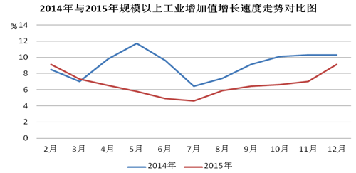 2015年是“十二五”規(guī)劃的收官之年,在復雜嚴峻的國內(nèi)外經(jīng)濟形勢下,我市勇于面對困難,砥礪前行,各項主要經(jīng)濟指標實現(xiàn)了穩(wěn)中向好的態(tài)勢運行,為明年經(jīng)濟發(fā)展打下了良好的基礎。 經(jīng)濟各供給端穩(wěn)中向好運行 第四季度,我市累計實現(xiàn)地區(qū)生產(chǎn)總值287.92億元,同比增長8.2%,增長速度比第三季度快0.8個百分點。 (一)實物生產(chǎn)供給呈穩(wěn)中有升勢頭 我市生產(chǎn)市場端日漸適應經(jīng)濟新常態(tài),生產(chǎn)發(fā)展曲線比2014年平滑,呈現(xiàn)穩(wěn)中有升的發(fā)展勢頭。12月份止,我市規(guī)模以上工業(yè)累計實現(xiàn)工業(yè)增加值109.26億元,同比增長9.1%,增長幅度比11月份上升2.1個百分點。其中:裝備制造業(yè)完成工業(yè)增加值39.33億元,同比增長20.80%,比規(guī)模以上工業(yè)增加值增速快11.7個百分點,成為我市制造業(yè)的增長亮點。2014年至2015年12月份規(guī)模以上工業(yè)增加值增長速度運行情況, 見下圖: 圖1: 從圖中所見,2015年,規(guī)模以上工業(yè)增加值的增長速度總體呈大“V”型的態(tài)勢發(fā)展,由7月份起呈緩慢上升的良好態(tài)勢運行。雖然在經(jīng)濟新常態(tài)下規(guī)模以上工業(yè)增加值增長速度比2014年進一步下行,但運行走勢相對2014年平緩,波動幅度為4.5%,波幅比2014年下降0.8個百分點。 (二)資金供給平穩(wěn) 1.金融市場貨幣資金供給平穩(wěn)。我市金融機構(gòu)各項存、貸款的發(fā)展速度平穩(wěn),在年內(nèi)的波動較小。12月份止,各項貸款余額達225.12億元,比去年同期增長15.93%;各項存款余額479.85億元,同比增長7.51%,其中:住戶存款348.69億元,占存款總量72.67%,是我市貨幣資金供給主要來源。 2.政府資金供給穩(wěn)定。政府資金對社會公共事業(yè)建設的供給力度穩(wěn)定,近年我市財政資金對公共支出供給均保持著兩位數(shù)的增長速度。12月份止,我市一般公共預算支出同比增長21.09%,對公共安全、教育、社會保障和就業(yè)等方面的支出均保持著較快增長的態(tài)勢。 (三)流通市場供給向好 我市流通市場的供給運行向好,消費品零售市場活躍,發(fā)展速度由年初開始緩速爬坡至6月份的兩位數(shù)增長后保持著較為平穩(wěn)的態(tài)勢運行。12月份止,我市累計完成社會消費品零售總額157.23億元,同比增長11.0%。 (四)房地產(chǎn)市場供給流轉(zhuǎn)加快 我市房地產(chǎn)市場在國家一系列政策組合拳的刺激推動下,逐漸擺脫2014年以來的低迷走勢,商品房施工面積由年初開始均保持兩位數(shù)的增長速度,而商品房的銷售面積增長速度則由6月份開始比商品房竣工面積增長速度快。1--12月,我市商品房施工面積同比增長24.30%、商品房竣工面積同比下降37.83%、商品房的銷售面積同比增長56.61%,商品房的銷售面積增長速度比竣工面積的增長速度快94.44個百分點??梢钥闯觯沂蟹康禺a(chǎn)市場供給流轉(zhuǎn)較快,去庫存化明顯,有利于房地產(chǎn)市場的持續(xù)健康發(fā)展。