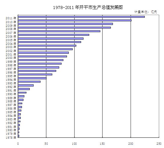 改革開放三十多年,開平市經(jīng)濟以跨越式發(fā)展的態(tài)勢,經(jīng)濟總量不斷壯大。2011年我市生產(chǎn)總值是224.84億元,其總量是1978年的119倍。從1978年改革開放到2011年的34年間地區(qū)生產(chǎn)總值的年均增長速度是15.61%。其發(fā)展經(jīng)歷了以下三個階段的跨越增長(見圖1)。第一次跨越:于1989年,創(chuàng)造出經(jīng)濟總量超10億元,總量達到11.21億元,比1978年翻了5倍,1978年至1989年的年均增長率是17.67%;第二次跨越:于2003年,創(chuàng)造出經(jīng)濟總量超100億,總量達到103.05億元,比1989年翻了8倍,1990年至2003年的年均增長率是18.60%;第三次跨越:于2010年,創(chuàng)造出經(jīng)濟總量超200億,總量達到201.14億元,比2003年翻了1倍,2004年至2010年的年均增長率是10.03%。