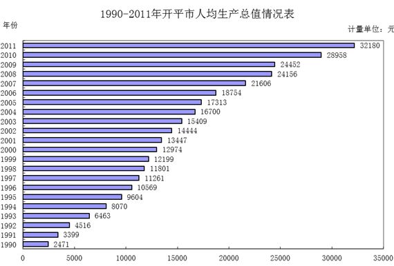 人均地區(qū)生產(chǎn)總值是衡量一個地區(qū)收入水平的標(biāo)志,也是作為劃分經(jīng)濟發(fā)展階段的重要指標(biāo)。根據(jù)江門統(tǒng)計年鑒1990年以來開平市的常住人口數(shù)據(jù)為計算人均地區(qū)生產(chǎn)總值起點,計算結(jié)果顯示:我市人均生產(chǎn)總值呈逐年遞增的穩(wěn)步增長態(tài)勢發(fā)展(見圖2)。2011年我市人均地區(qū)生產(chǎn)總值達到32180元,是1990年2471元的12倍,年均增長13%,比同期地區(qū)生產(chǎn)總值年均增長速度低0.77個百分點。根據(jù)1990—2011年的計算結(jié)果推算得出:我市用19年時間創(chuàng)造出人均生產(chǎn)總值超萬元,在1996年達到10569元,然后再用12年時間創(chuàng)造出人均生產(chǎn)總值翻一番,在2007年達21606元。